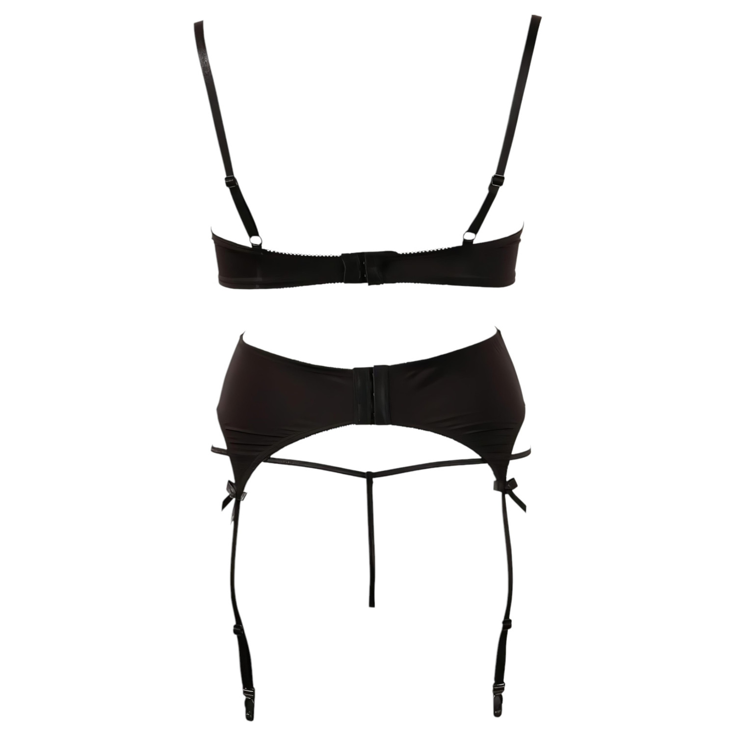 Ta på bh-en, juster stroppene for perfekt passform, og fest deretter strømpeholderen til dine favorittstrømper. Fullfør settet med den åpne tangaen - slik blir utseendet forførende og romantisk.