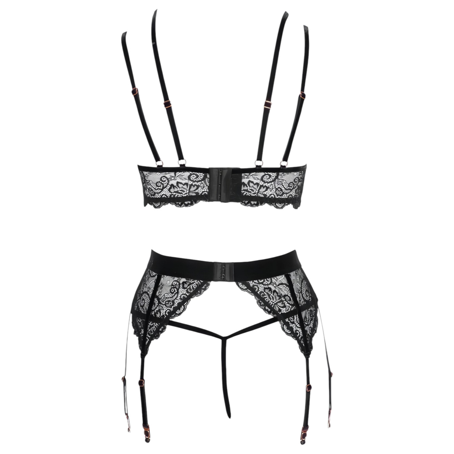 Forførende sett i åpen bh og truse med hofteholder laget av blonder - Abierta Fina blondeflørter setter garantert din mest forførende side i fokus!