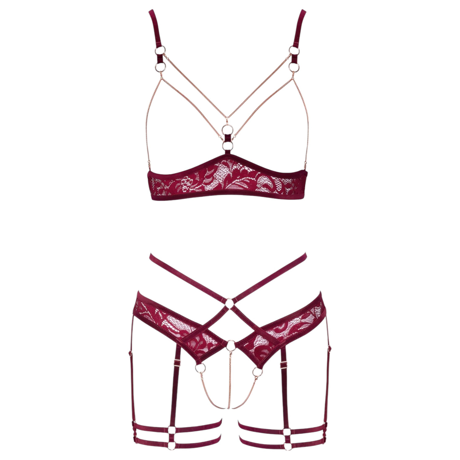 Sanselig og elegant undertøysett laget av forførende rød blonde med unike rosegullkjededetaljer - Abierta Fina kjedet løfte-sett!