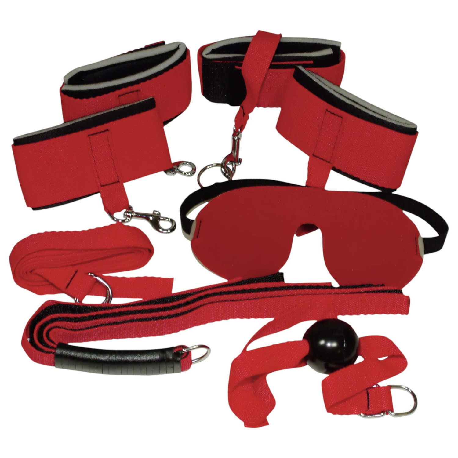 Dykk inn i den spennende verden av bondage med dette komplette settet! Med øyemaske, gag, mini-pisk og justerbare stropper på håndledd- og ankelmansjettene, er alt klart for en uforglemmelig opplevelse.