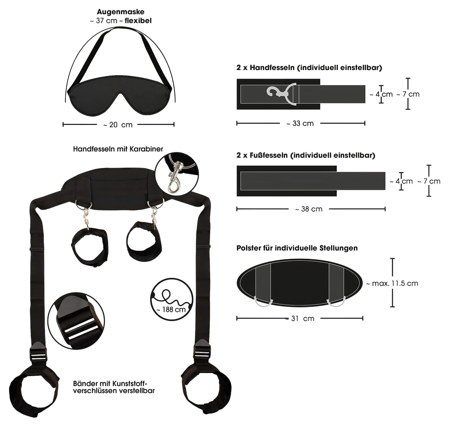 Dette settet er perfekt for de som vil utforske og lære mer om seg selv og partnerens skjulte, intime hemmeligheter, og som ønsker å utfylle sin seksualitet! Dette festesettet er laget av sterkt materiale og har en myk overflate, så BDSM-leken blir aldri ubehagelig!