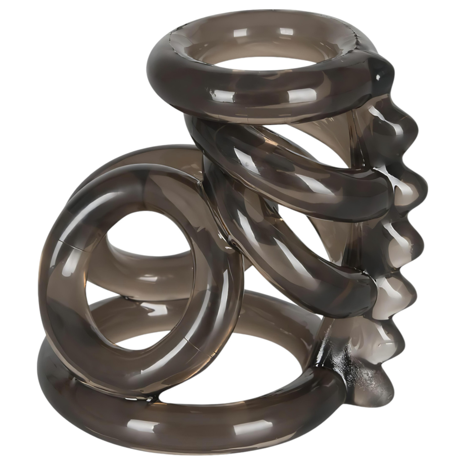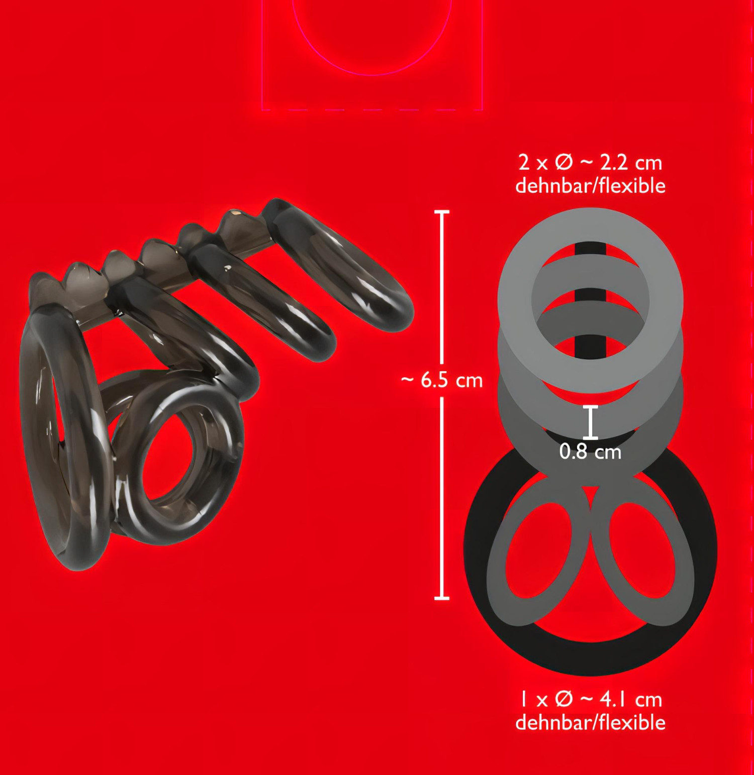 Tre ringer med lik diameter som plasseres på penis, en med større diameter som går rundt testiklene, og to sammenflettede testikkelringer som gir en følelse av behagelig omsluttelse.