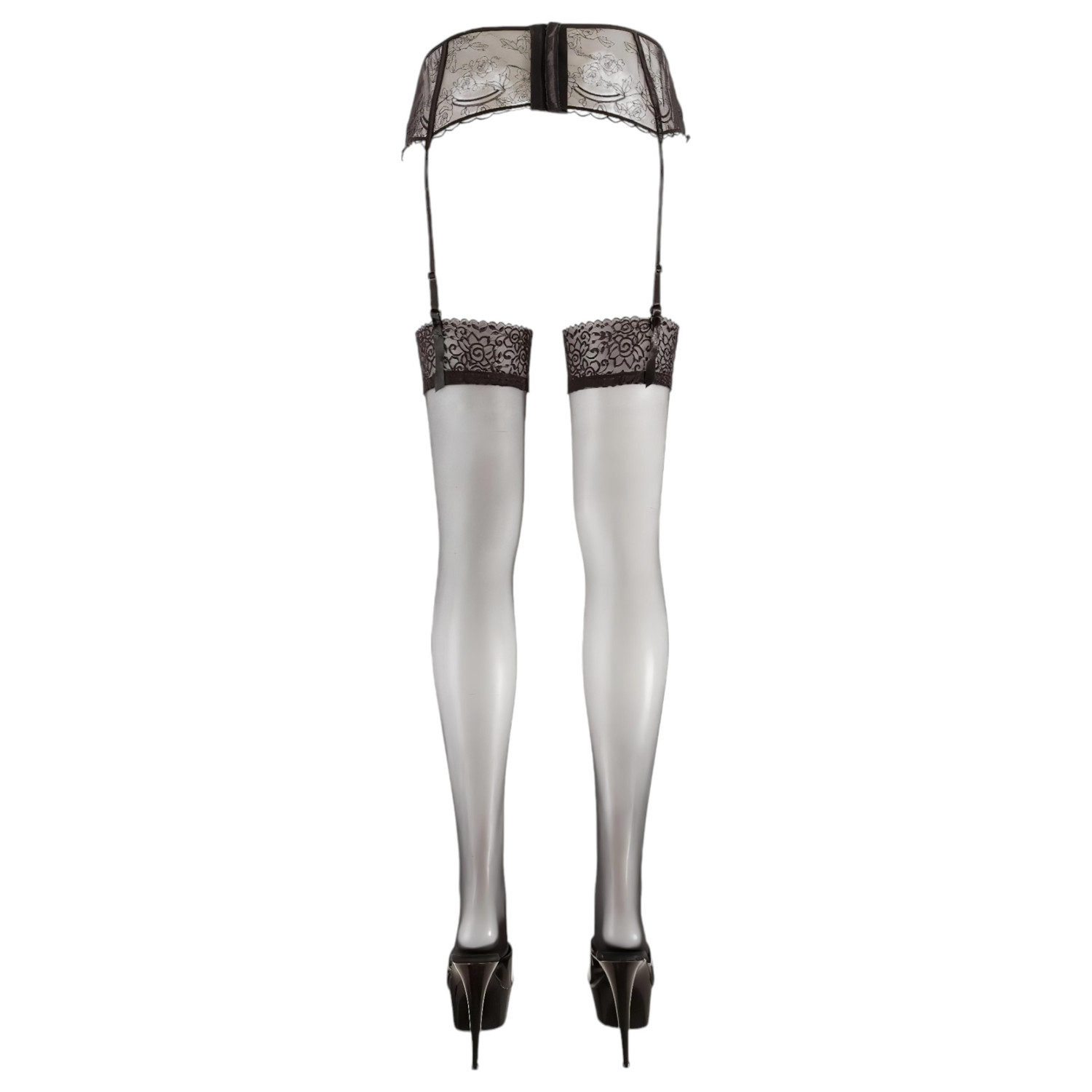 Gjennomsiktige strømper til lårene med bred blondekant.