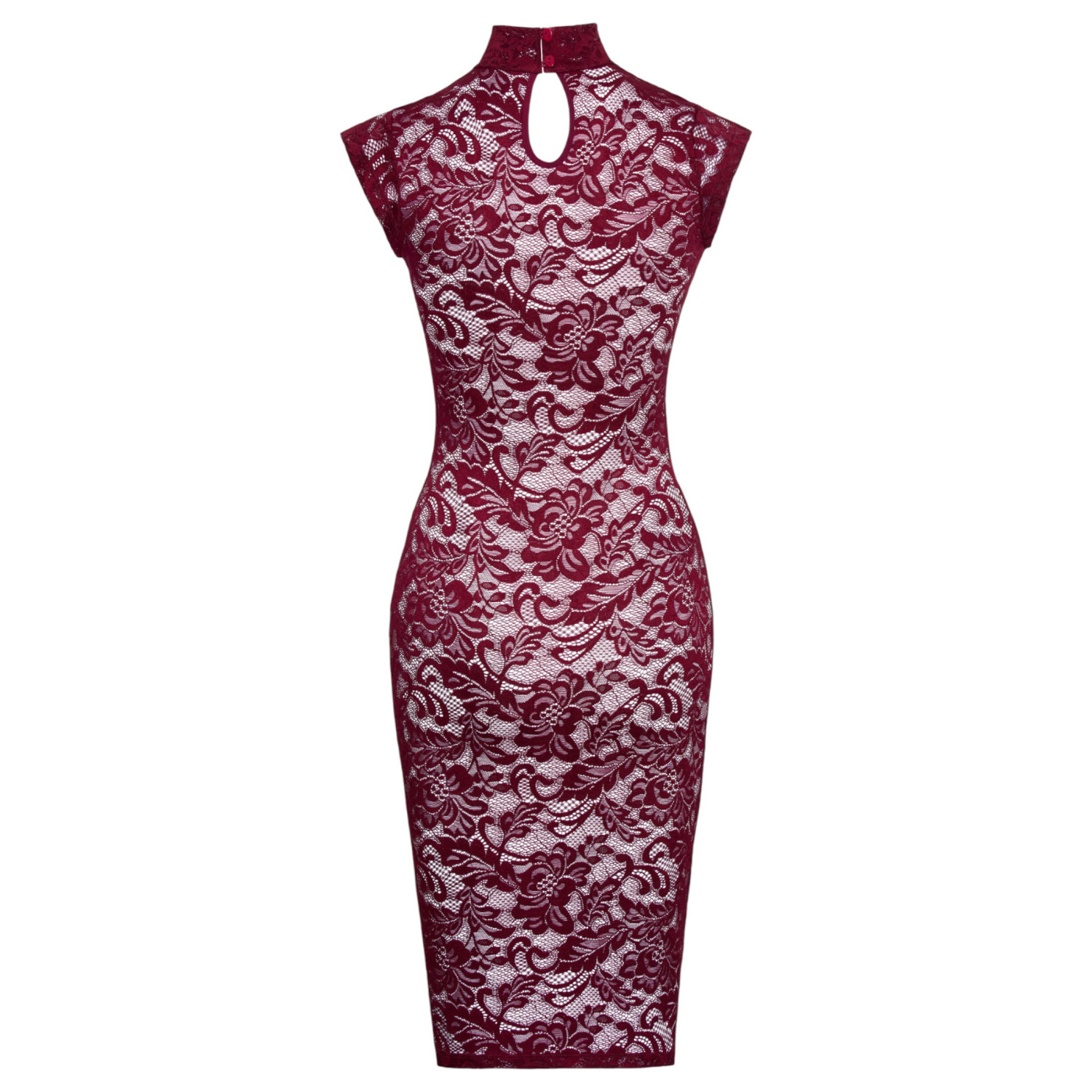 Denne ermeløse kjolen, som rekker til knærne, er laget av spesialdesignet Bordeaux rød blonde, som forsiktig følger kroppens kurver og fremhever den feminine silhuetten. Det myke, fleksible materialet gir komfortabel bevegelse og perfekt passform, noe som gjør den ideell for romantiske kvelder, forførelse eller som elegant undertøy. En knappelukking bak kragen gir en ekstra touch av eksklusivitet.