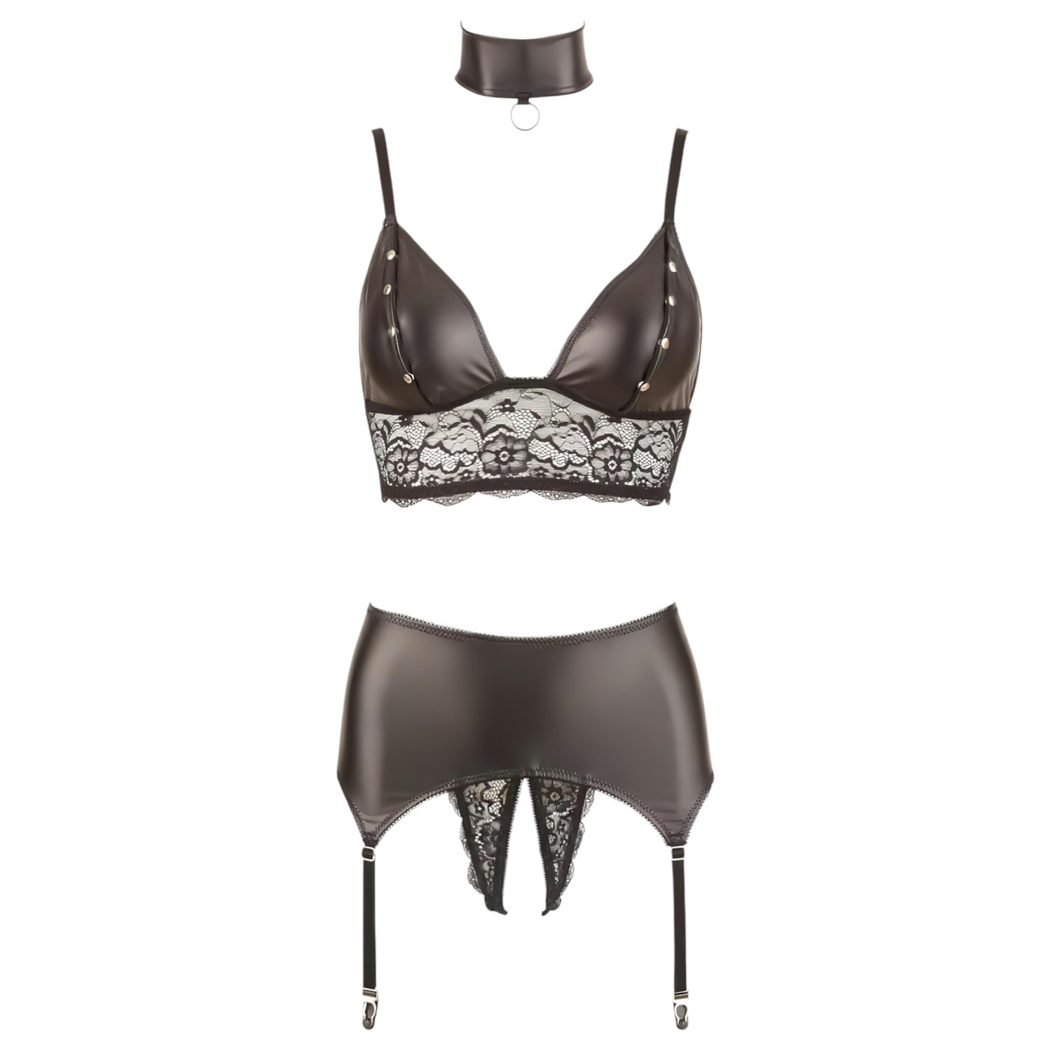 • Komplett sett: BH, truse med strømpeholdere, halsbånd og håndjern sørger for en fullstendig opplevelse.