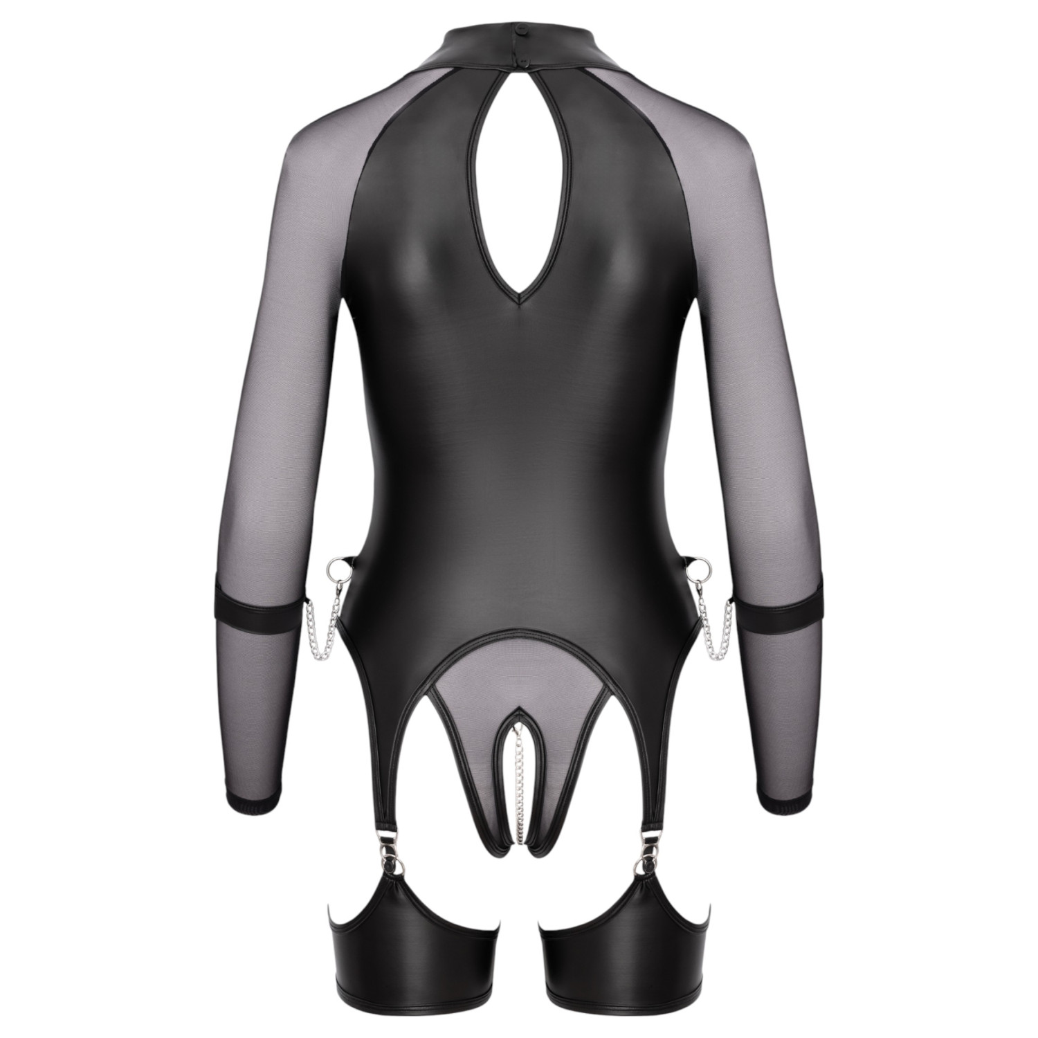 Cottelli Bondage gjennomsiktig, skinnende topp er den perfekte kombinasjonen av dristig erotikk og elegant design. Den tettsittende, langermede bodyen er laget av en kombinasjon av gjennomsiktige og matte materialer som er både elegante og provoserende. Den avtagbare kjeden over det intime området, de avtagbare lårbåndene, og de skjulte glidelåsene ved brystet garanterer spenning. Settet inkluderer myke håndjern som kan festes til ringene på sidene av kroppen, noe som gir en virkelig allsidig og fantasifull lekeopplevelse.
