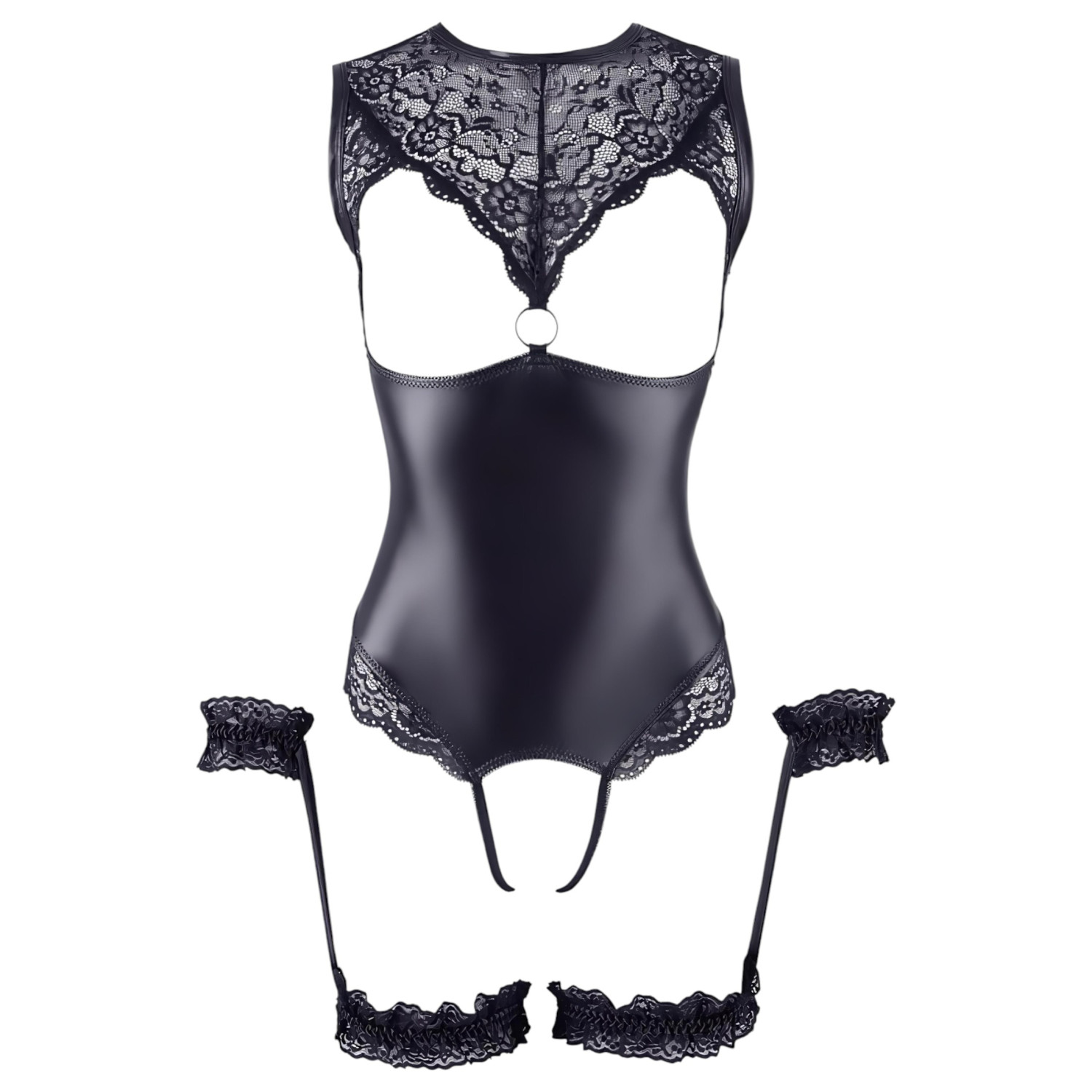 Cottelli Bondage - glinsende åpen kroppsdrakt med håndjern (svart) - M