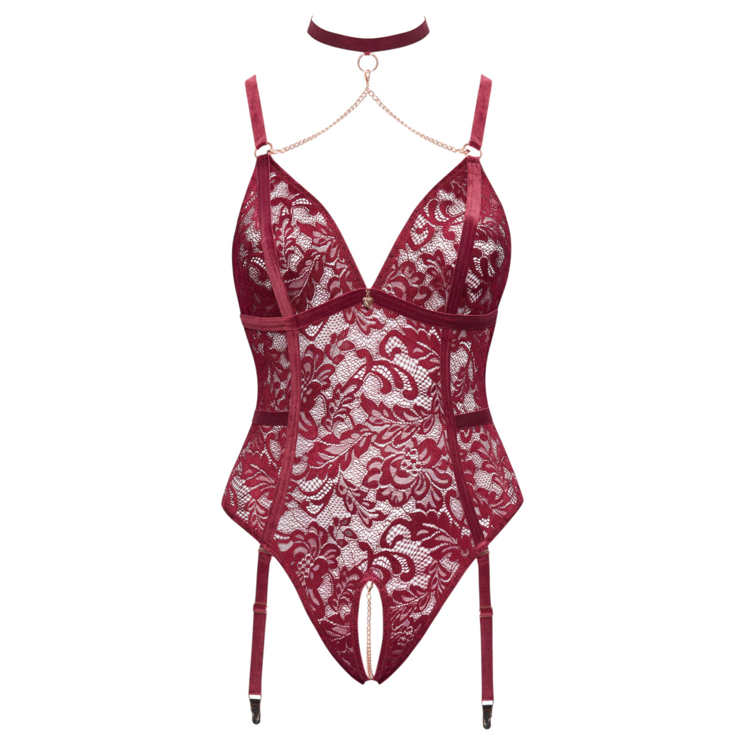 Cottelli Curves blondebody med kjede er et ideelt valg hvis du ønsker et undertøy som garantert fascinerer. Det dyprøde blondematerialet, de fløyelsaktige stroppene, og detaljene i rose gull gir et unikt, luksuriøst utseende. Det mest spennende elementet i bodyen er den avtakbare halsstroppen (choker), avtagbare dekolletékjeder og den stimulerende underlivskjeden, som er plassert over den helt åpne delen og kan fjernes. Den elastiske blonden gir komfort og perfekt passform, mens de justerbare stroppene gir full tilpasning til kroppen. Strømpestroppene og kjedene kan fjernes, slik at bodyen enkelt kan forvandles til en dristigere eller mer dempet stil.