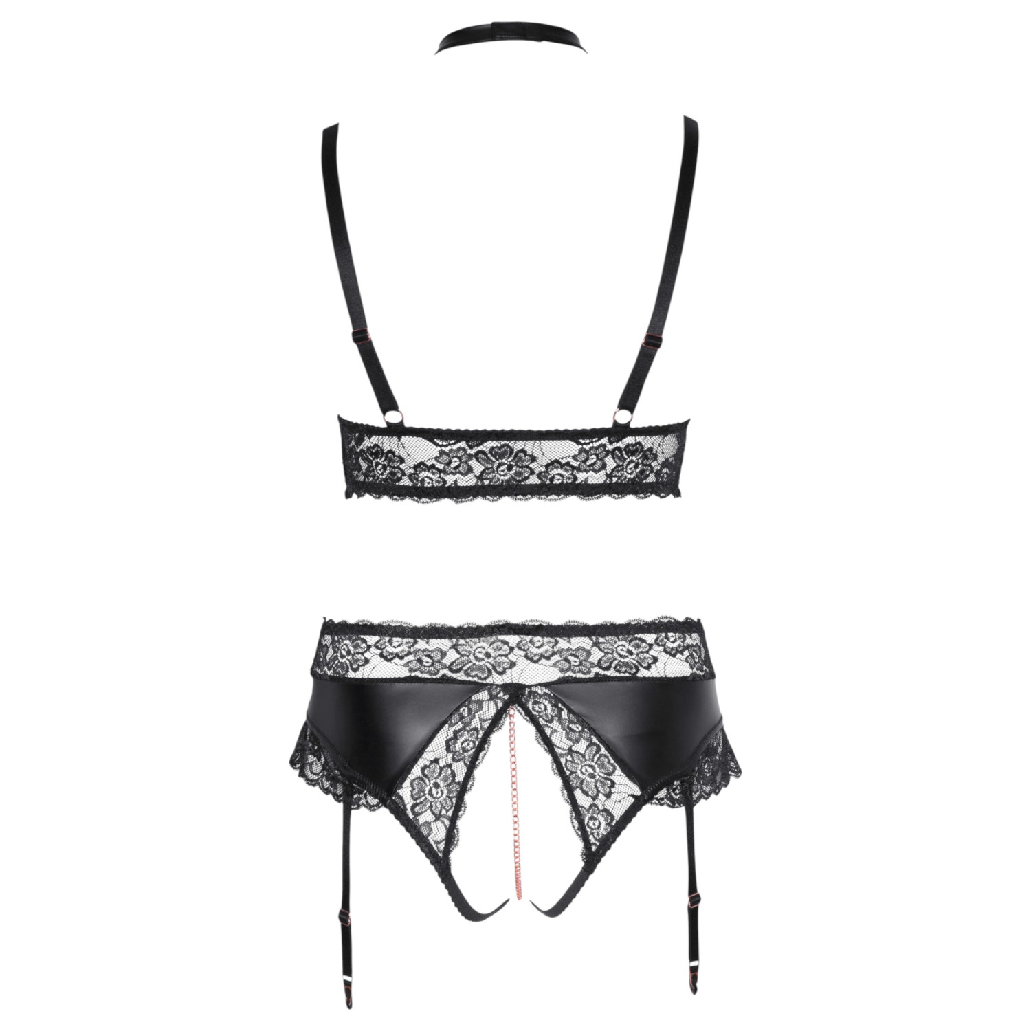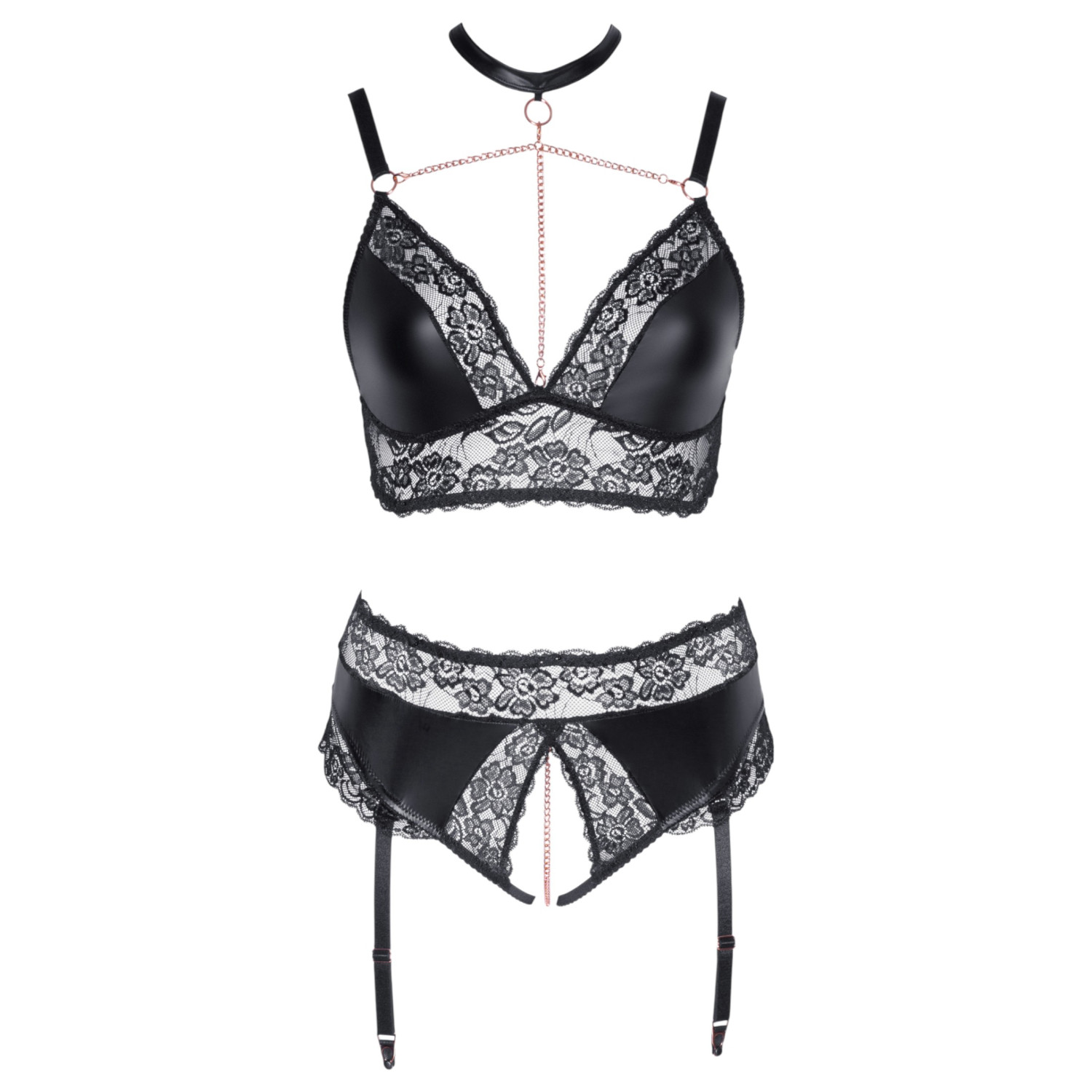 Cottelli Curves - blonder BH med kjeder og åpen truse med strømpebånd (svart) er et dristig, erotisk og allsidig undertøysett som kombinerer matt materiale, blonder og avtakbare kjededetaljer for å skape den perfekte forførelsen.