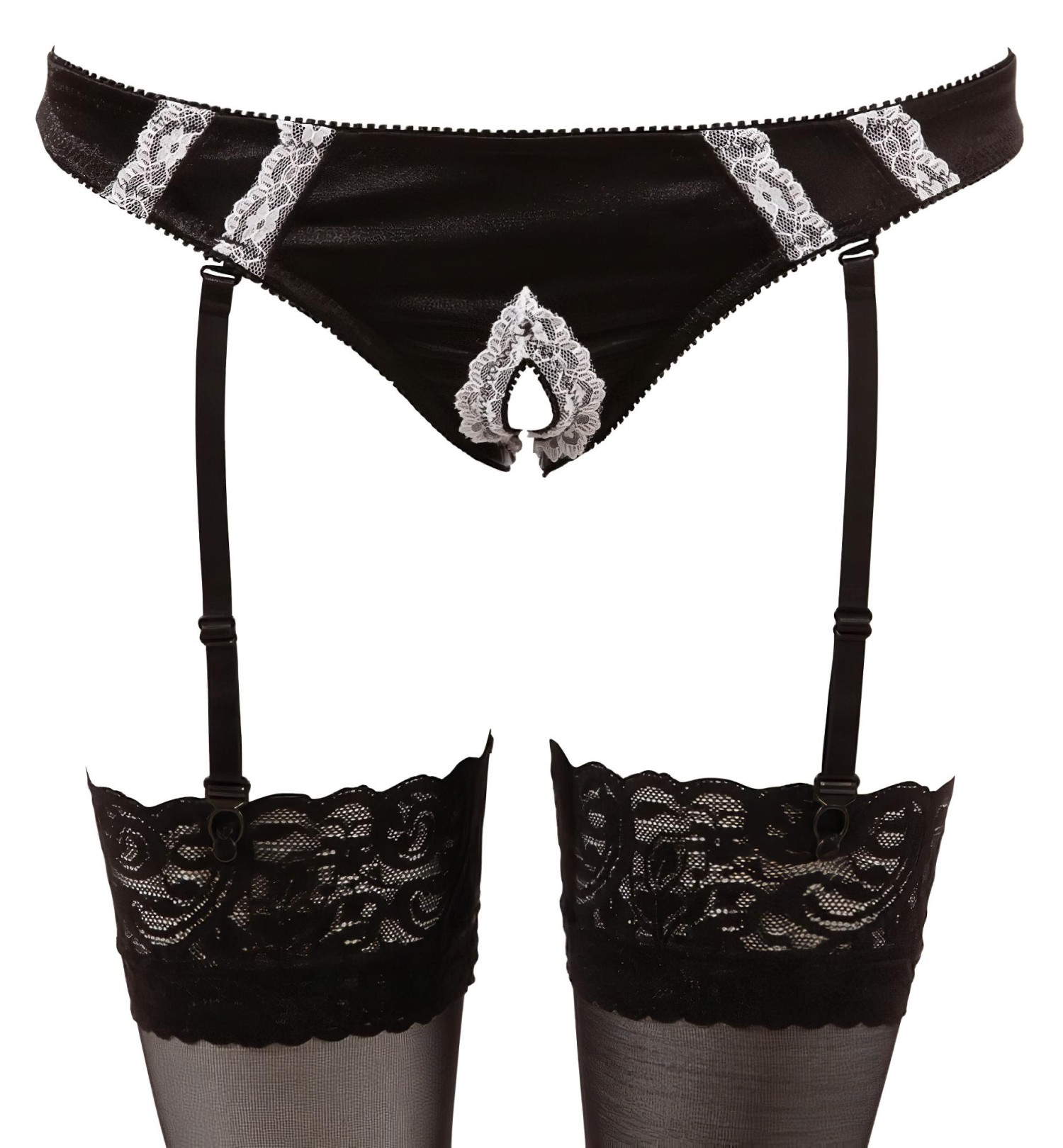 • Åpen design i skrittet med blondekant – gjør det mulig å bruke under akten, forsterker intimiteten.