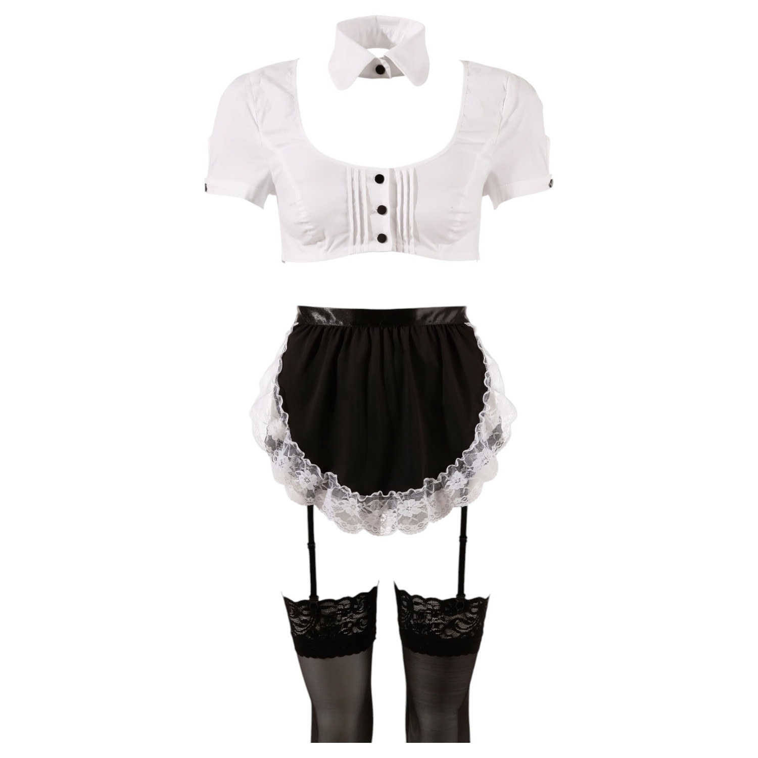 • Svarte blonde strømper, hvit knappløs krage, hodebånd og forkle med hvit blondekant, svart sateng midjebånd – gir et komplett utseende til rollespill.