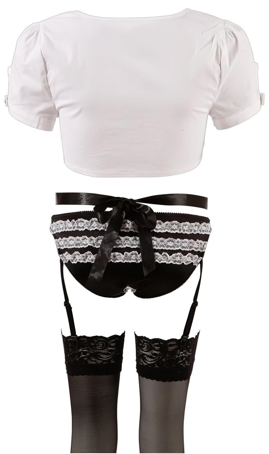 • 1 stk forkle med hvit blondekant, svart sateng midjebånd