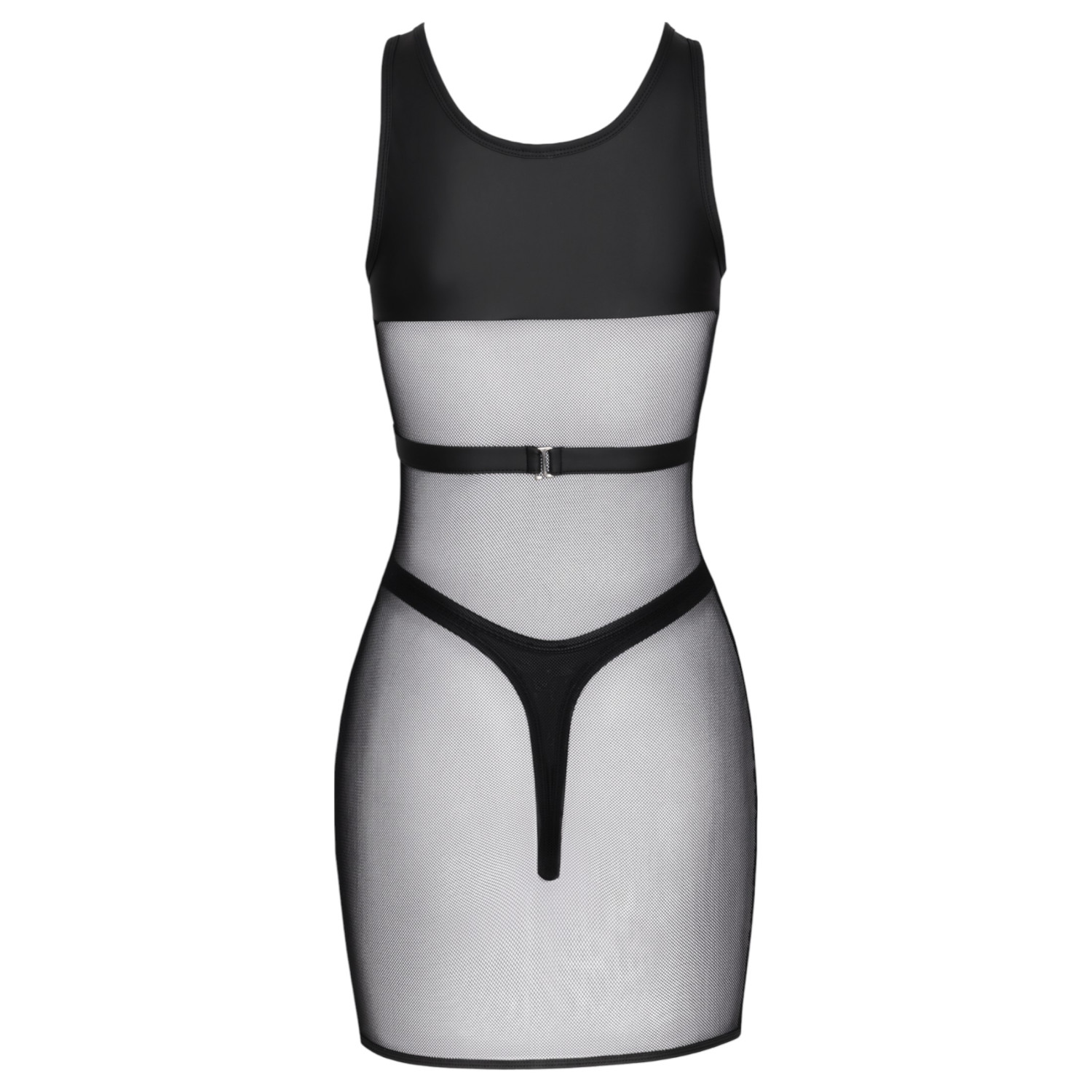 Dette provokative nettingkjole- og tangasettet er det perfekte valget hvis du ønsker noe virkelig dristig. Den kroppsnære minikjolen er laget av gjennomsiktig netting, mens den glinsende brystdelen og bh-stroppen er dekorert med metallringer, noe som gir en frekk, men elegant effekt. Det medfølgende høyt snittet glinsende tanga fremhever hoftene og baken. De elastiske materialene sørger for komfort hele natten!