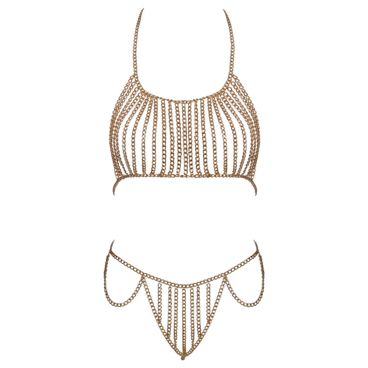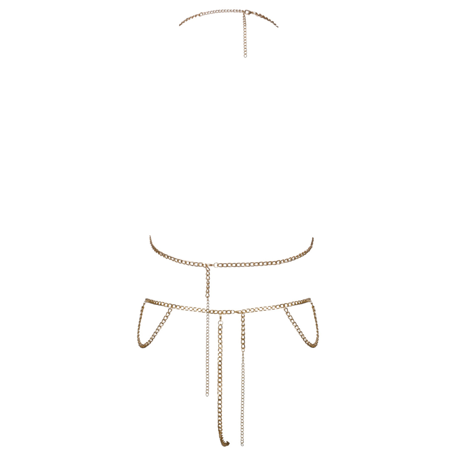 Cottelli - kjedebody (gull) er en luksuriøs erotisk gullfarget kjedebikini, med halter nakkerem, justerbare bakstropper og stimulerende intimkjede for et spektakulært, diva-lignende utseende.