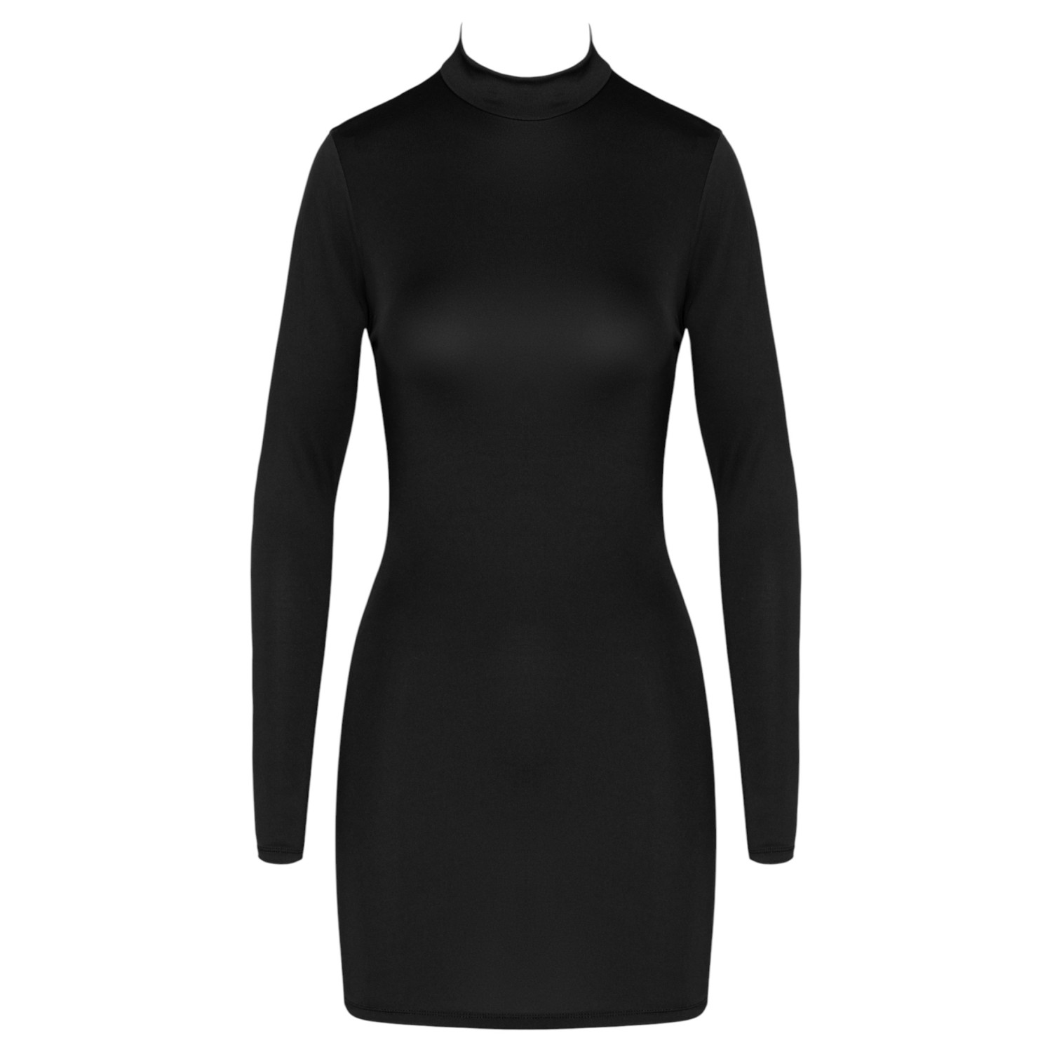 Denne stramme, langermede minikjolen er et perfekt valg hvis du ønsker et stilfullt, men utfordrende utseende. Med beskjeden front og dristig rygg, kombineres med 4 gyllenfargede, avtagbare kjeder langs ryggen for å fremheve kvinnelige former og skape en unik, luksuriøs følelse. Det elastiske, myke materialet smyger seg vakkert til kroppen, fremhever formene, og tilbyr komfort enten du danser eller nyter en het kveld.