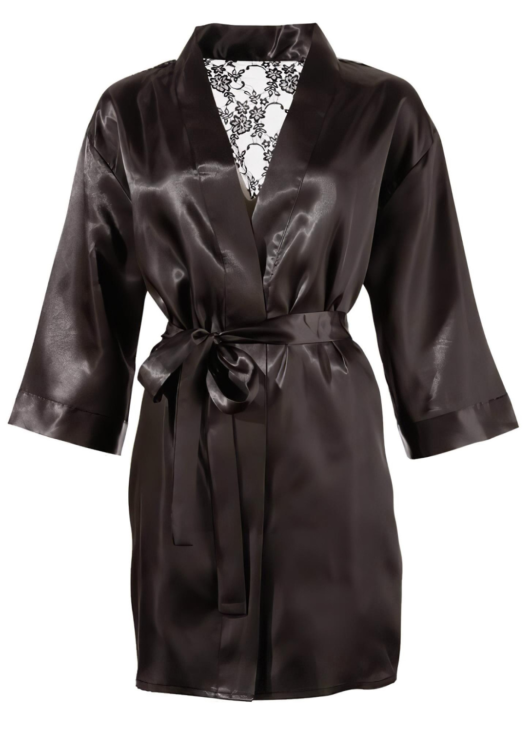 • 1 stk svart satengkimono med justerbart belte.