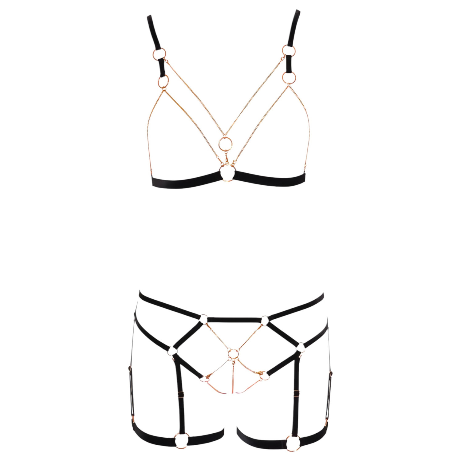 Den vakre, bare kroppen omfavnet av stropper er en av de mest pirrende synene i verden! Alt avslørende, sexy og forførende svarte stropper, sammensatt med kjeder, som erotisk fremhever formene på brystene, midjen og baken.