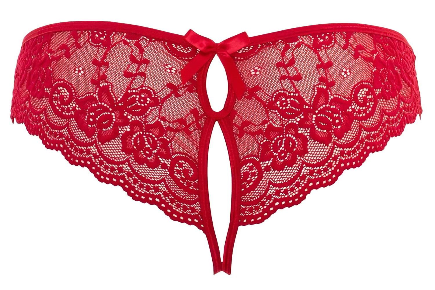Forførende, iøynefallende rød truse med lekre sløyfedetaljer, som freidig er åpen foran!