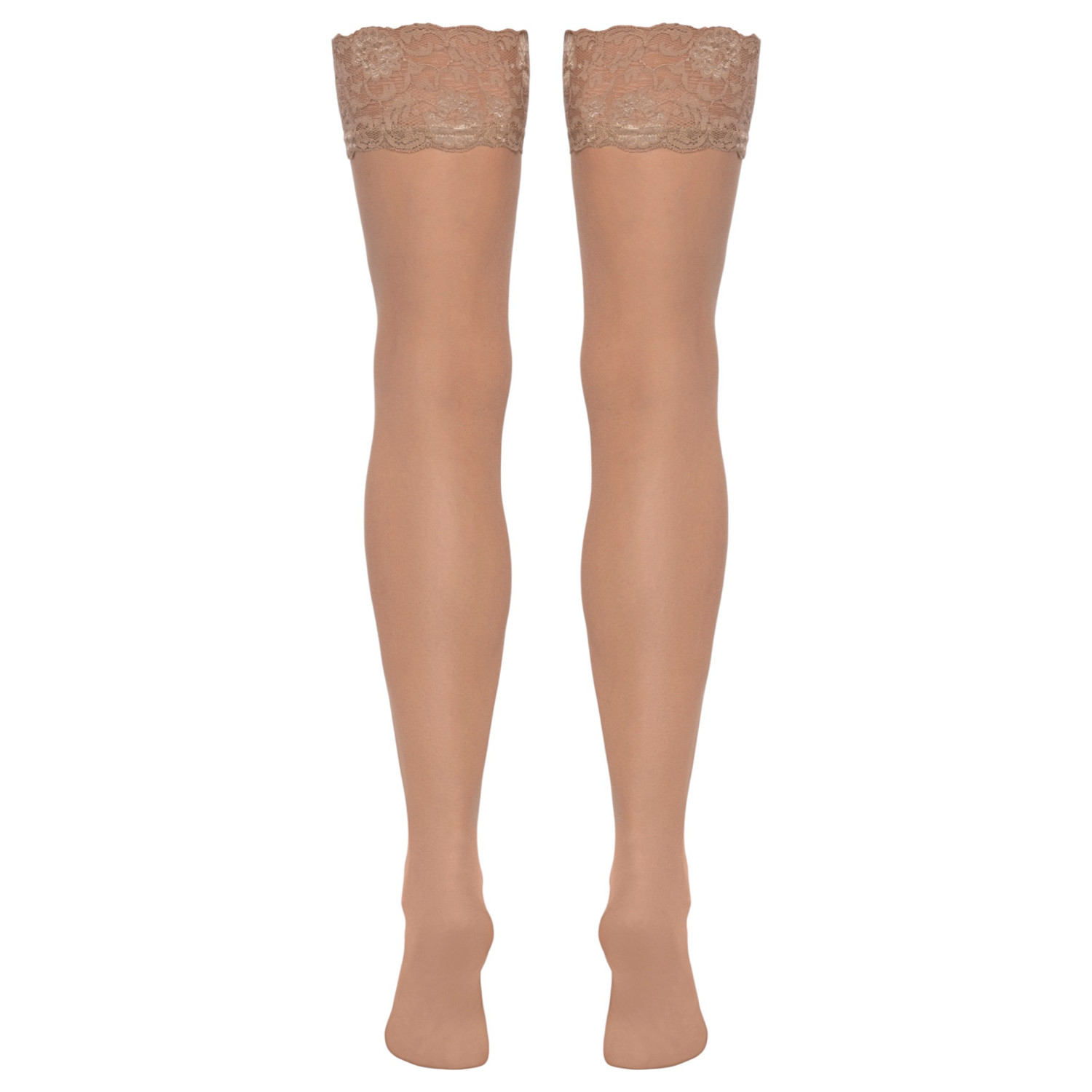 • Elegant blondetopp: Den 9 cm brede, elastiske blondekanten fremhever lårene vakkert.