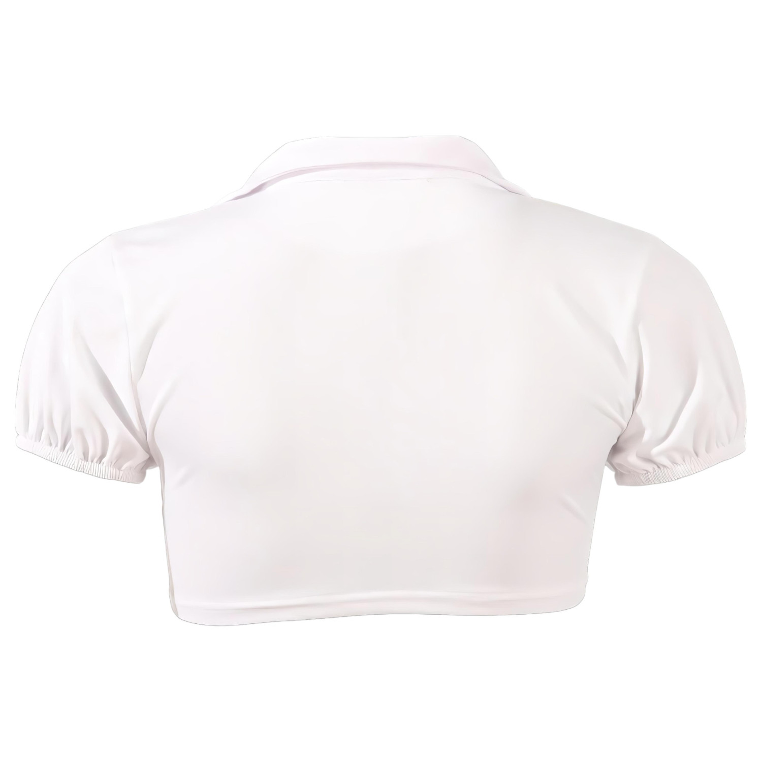 • Kort topp: Laget av elastisk, hvitt materiale, med knyting foran og ekstra dyp, rund utrigning som fremhever dine kurver.