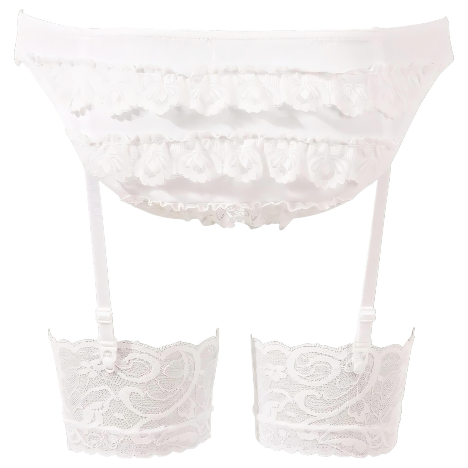 • Truse med strømpebånd og rysjer: Laget av elastisk materiale, pyntet med blondekanter bak og fire justerbare strømpebånd for perfekt passform.