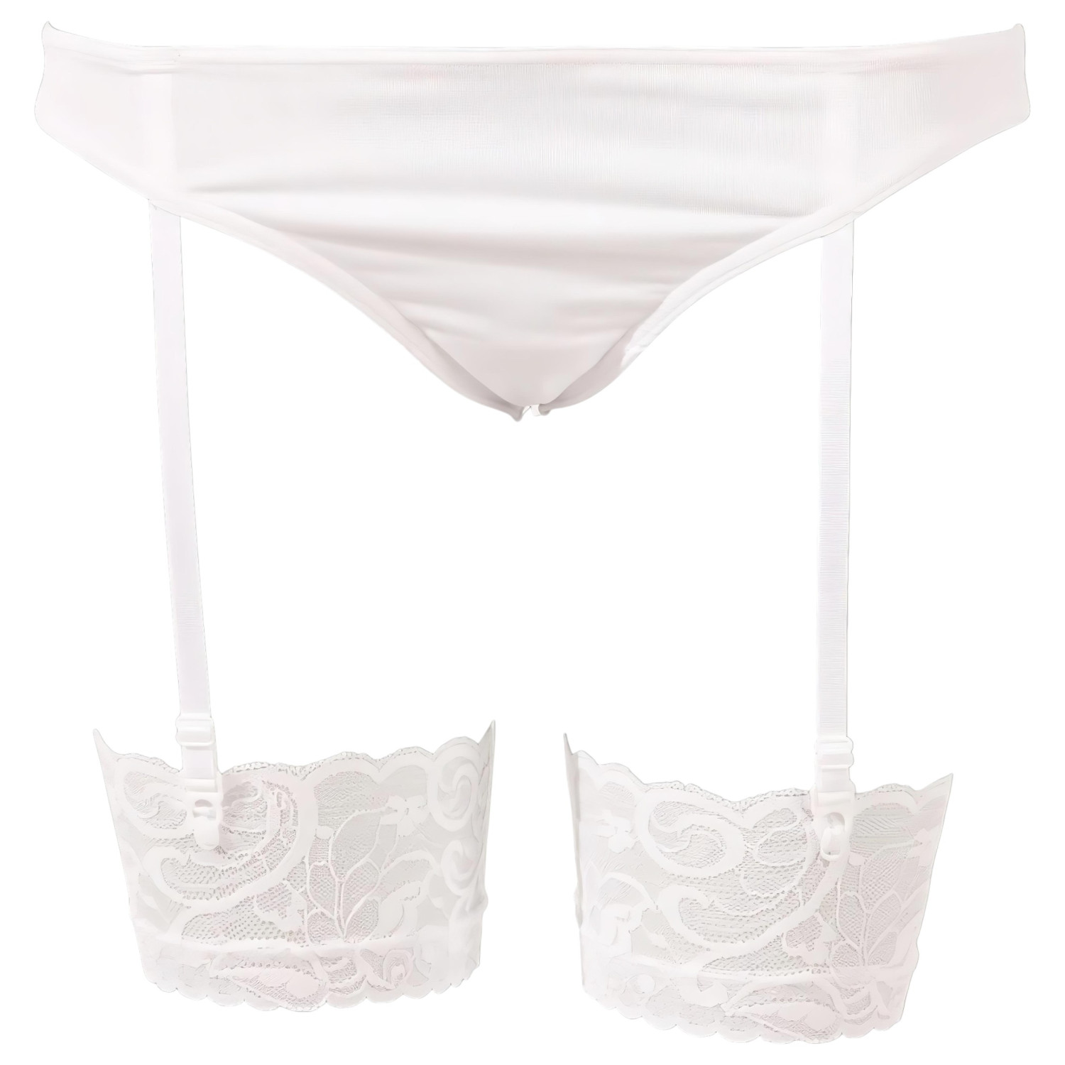 • Blonde strømpetr: Hvitt, elastisk, svakt skinnende materiale med blomstermønstret blondekant som gir et elegant utseende.