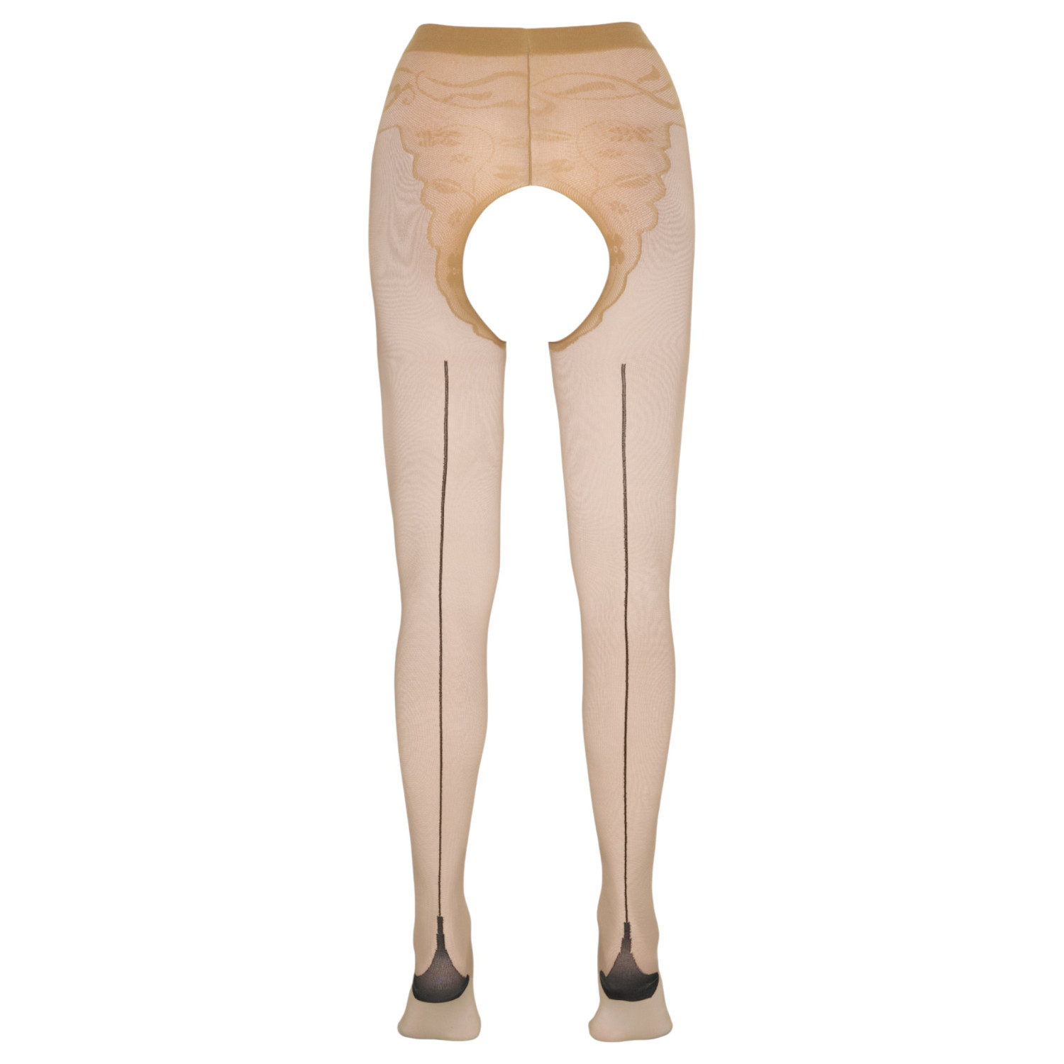 Tre forsiktig på strømpebuksen, pass på at den sitter jevnt. Takket være den åpne designen kan den brukes med undertøy eller alene, og er ideell for forspill eller under akten.