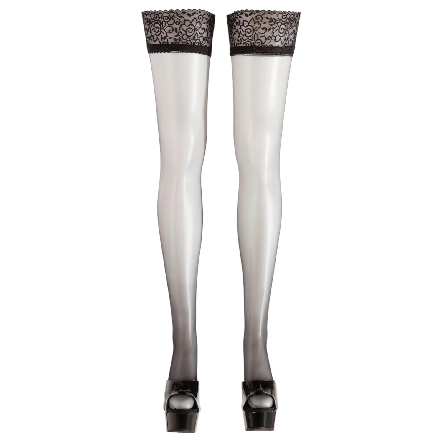 Gjennomsiktige strømper som rekker opp til lårene, med bred blondekant.