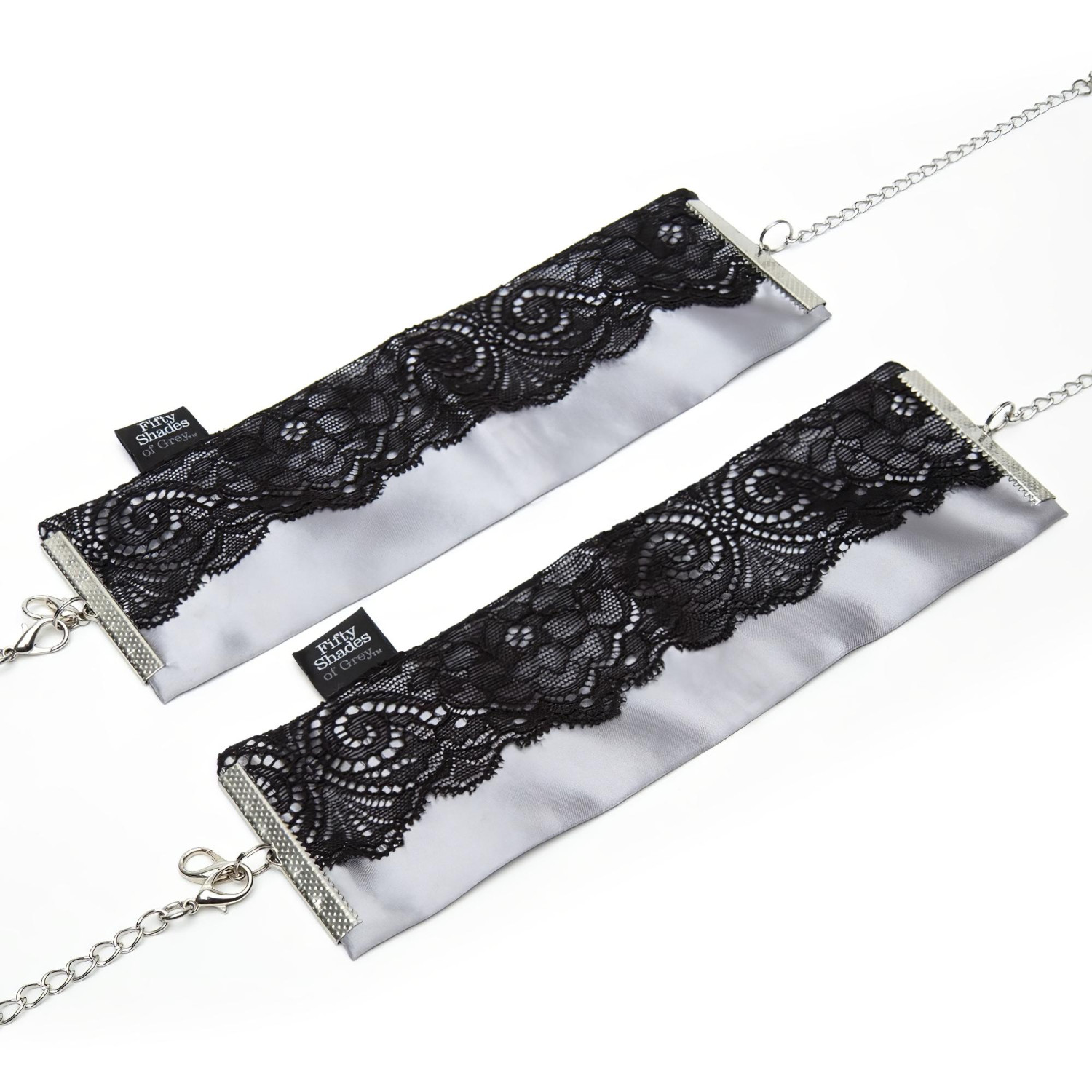 Følsomme, sølvfargede satenghåndjern par, med delikate sorte blondepynt.