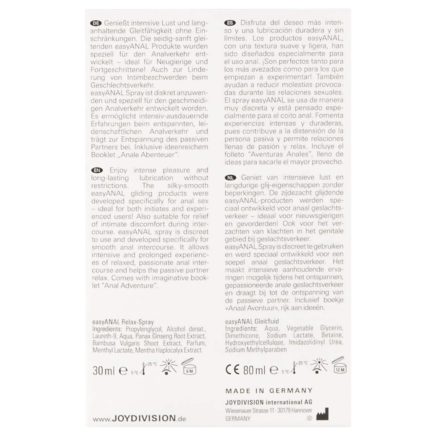 • easyANAL relax omsorgsspray: Maksimalt hudvennlig, formel for optimal penetrasjon, hjelper med å forbedre venøs sirkulasjon