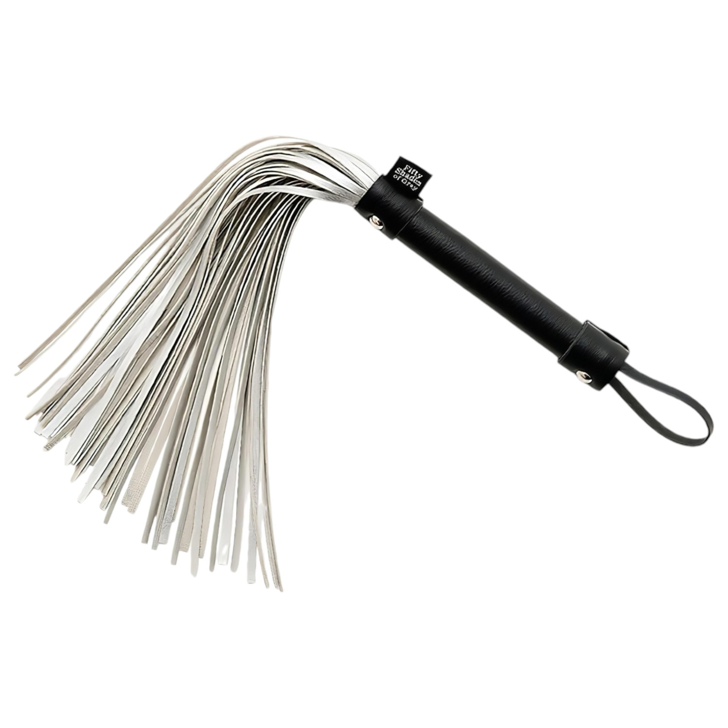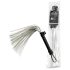 Eksklusiv designet pisk med myke, sølvfargede strenger, slitesterkt, svart, lærbelagt trehåndtak og praktisk grep.