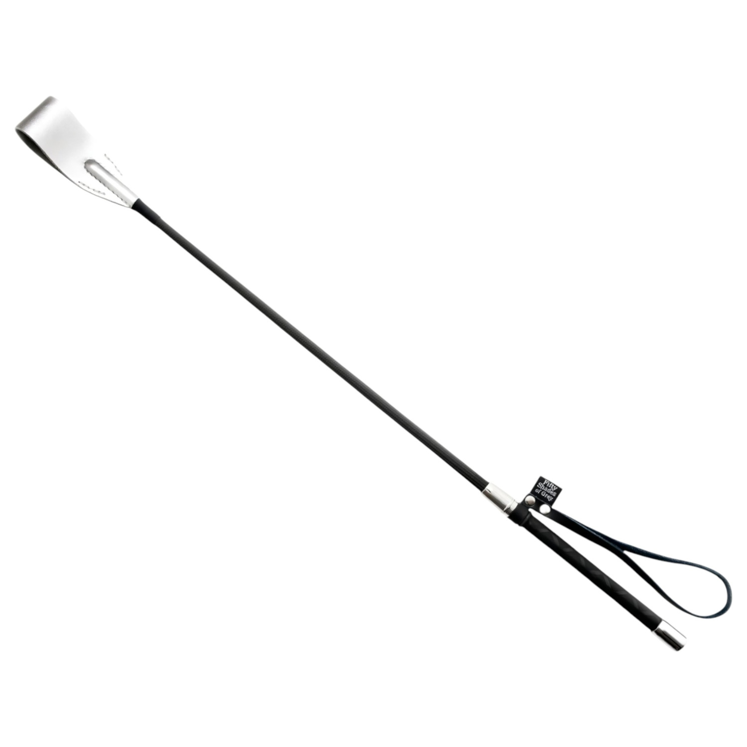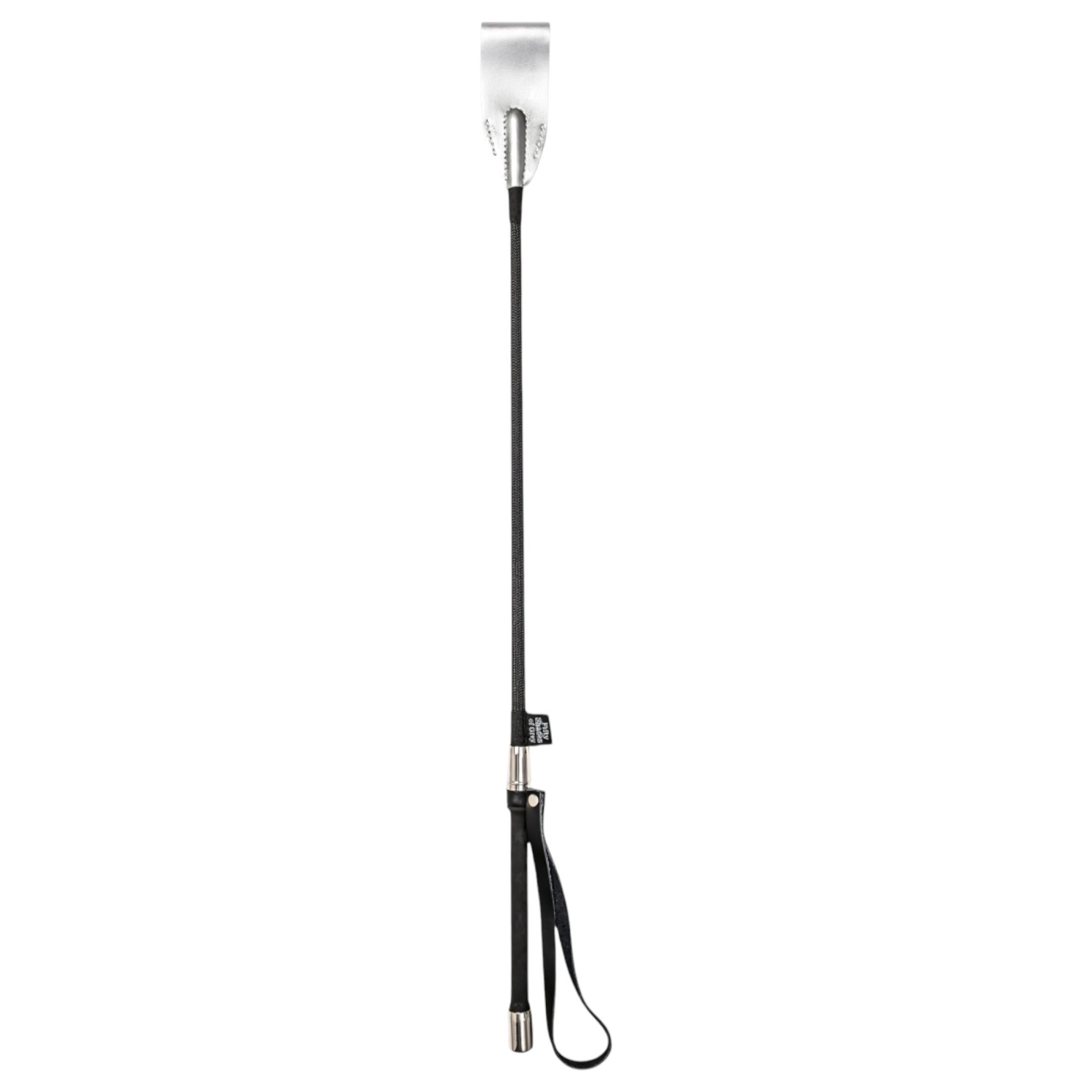 En eksklusivt utformet pisk laget av høykvalitets svart lær med et robust håndtak. For de pirrende, søte øyeblikkene! Enden er dekket med glitrende, skinnende sølv. Har en praktisk håndleddsstropp for sikkert grep.
