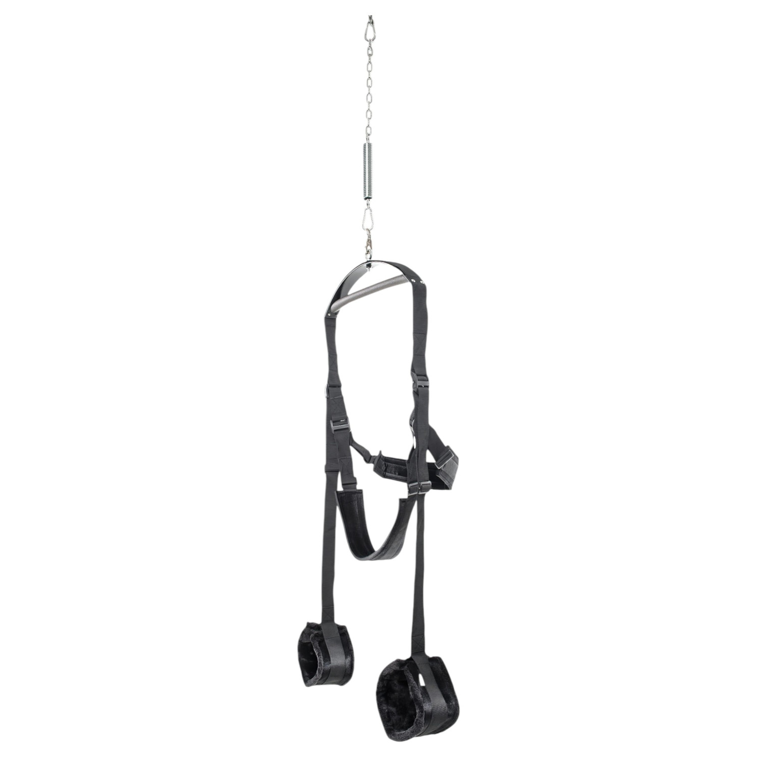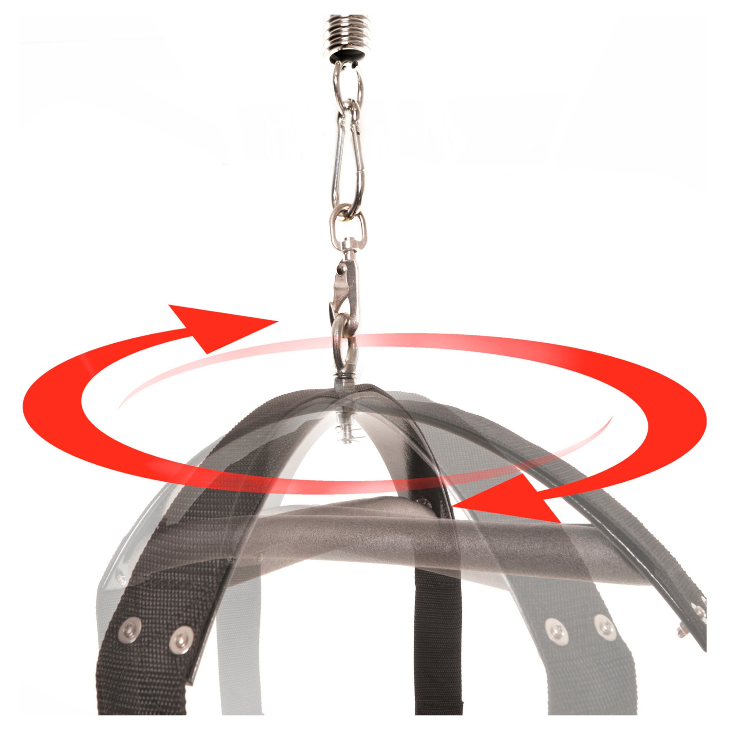 Fest husken til et passende, stabilt takpunkt eller et frittstående stativ. Juster stroppene til ønsket høyde og komfortnivå. Sett deg inn, plasser føttene i støttebåndene, og utforsk den ekstra spenningen swing og rotering gir.