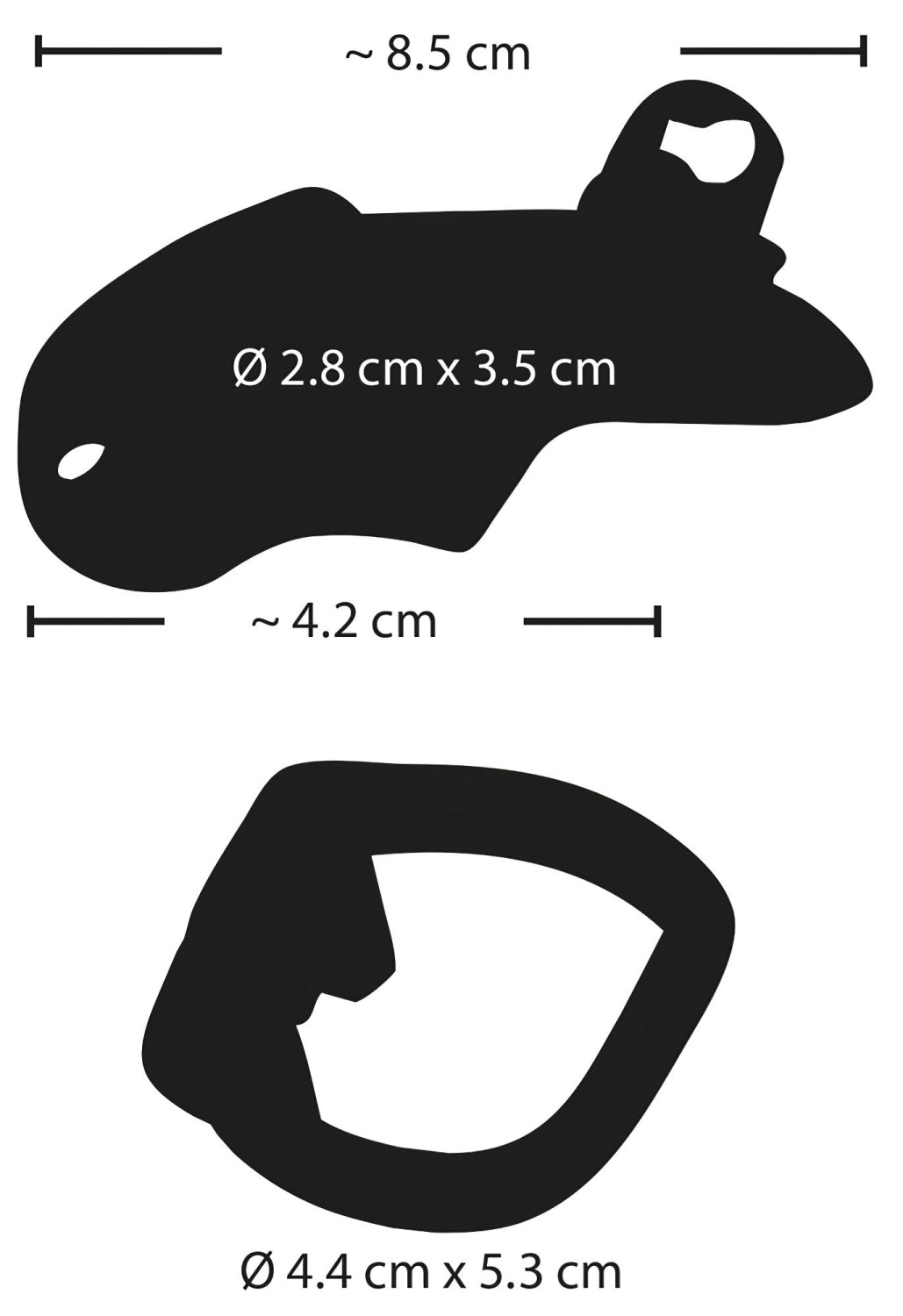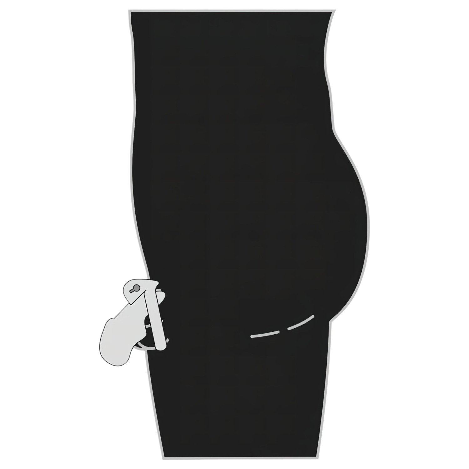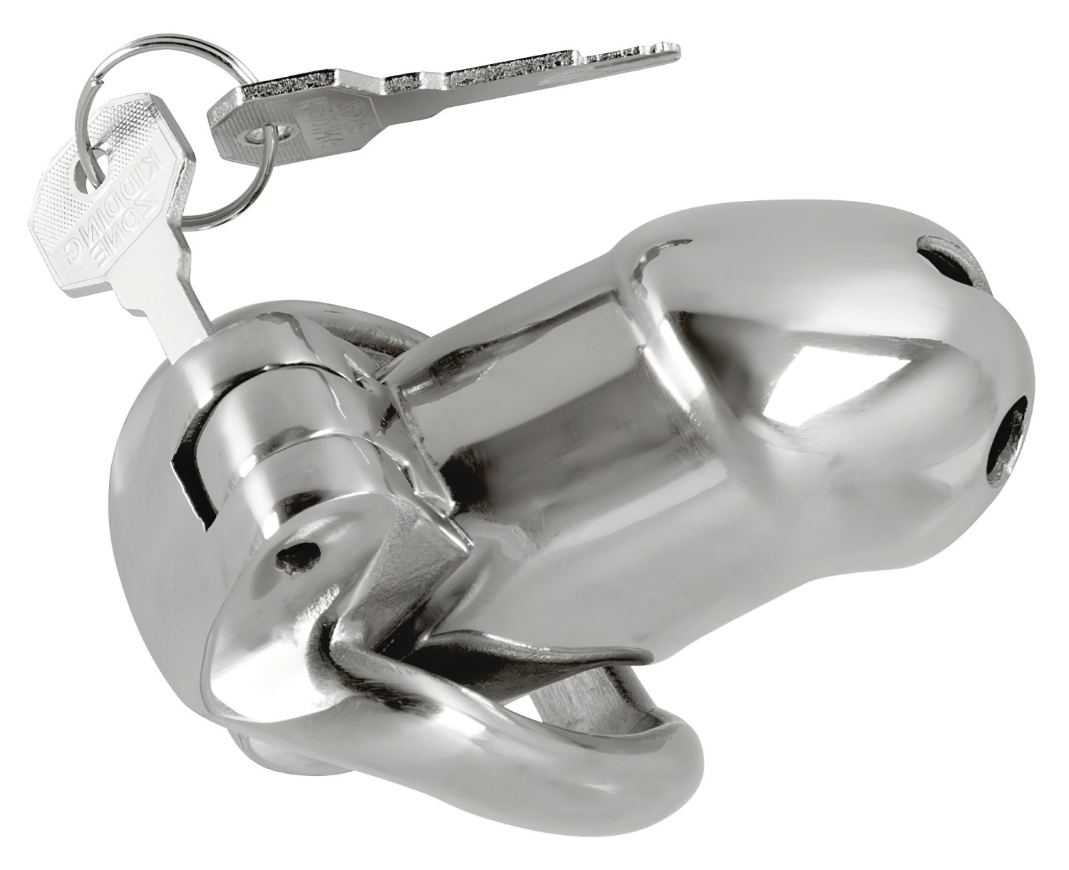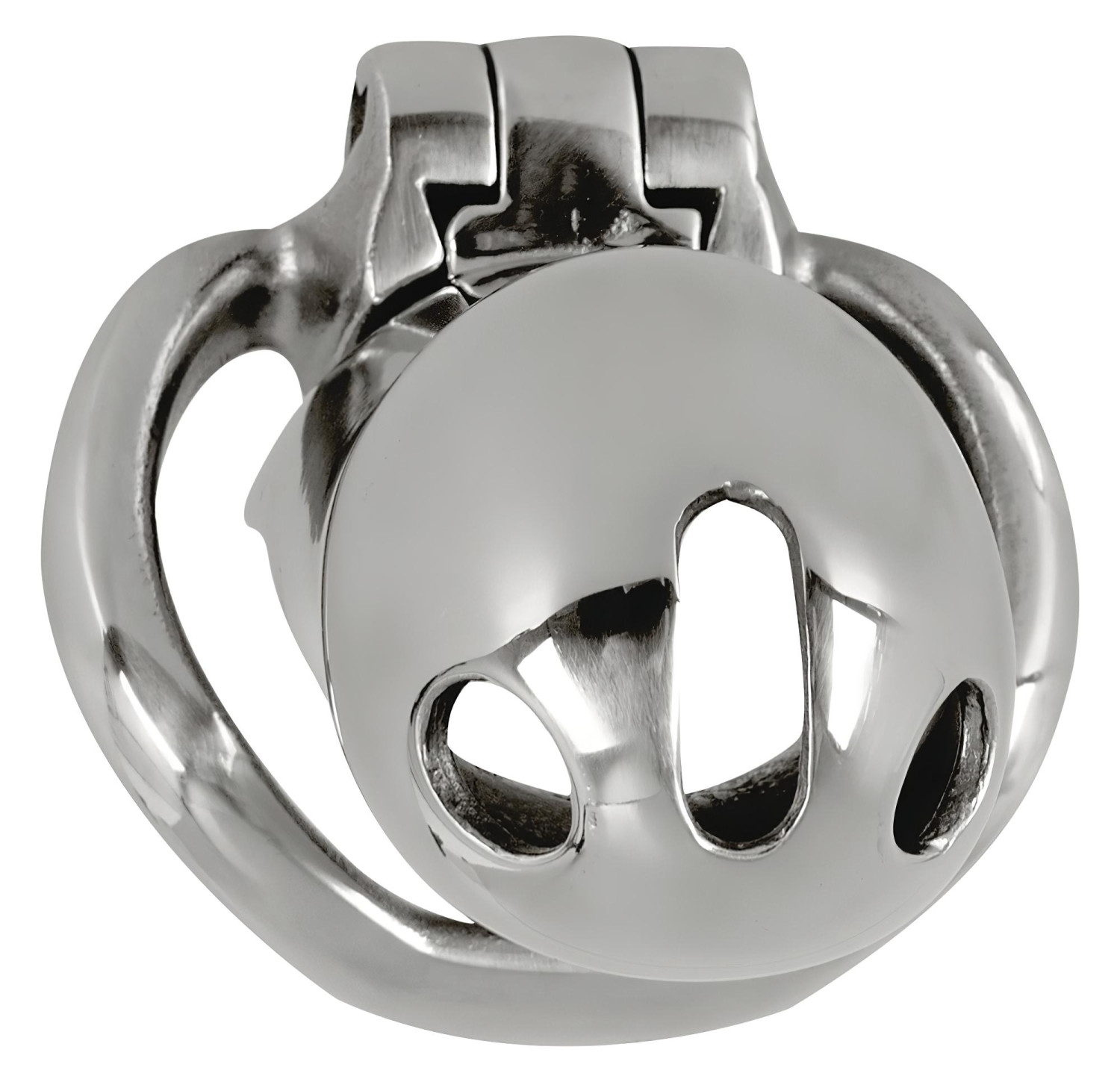 • Åpne hengelåsen, trekk metallringen opp til bunnen av penis slik at testiklene også er inkludert. Penisen passer perfekt inn i buret (i slapp tilstand).