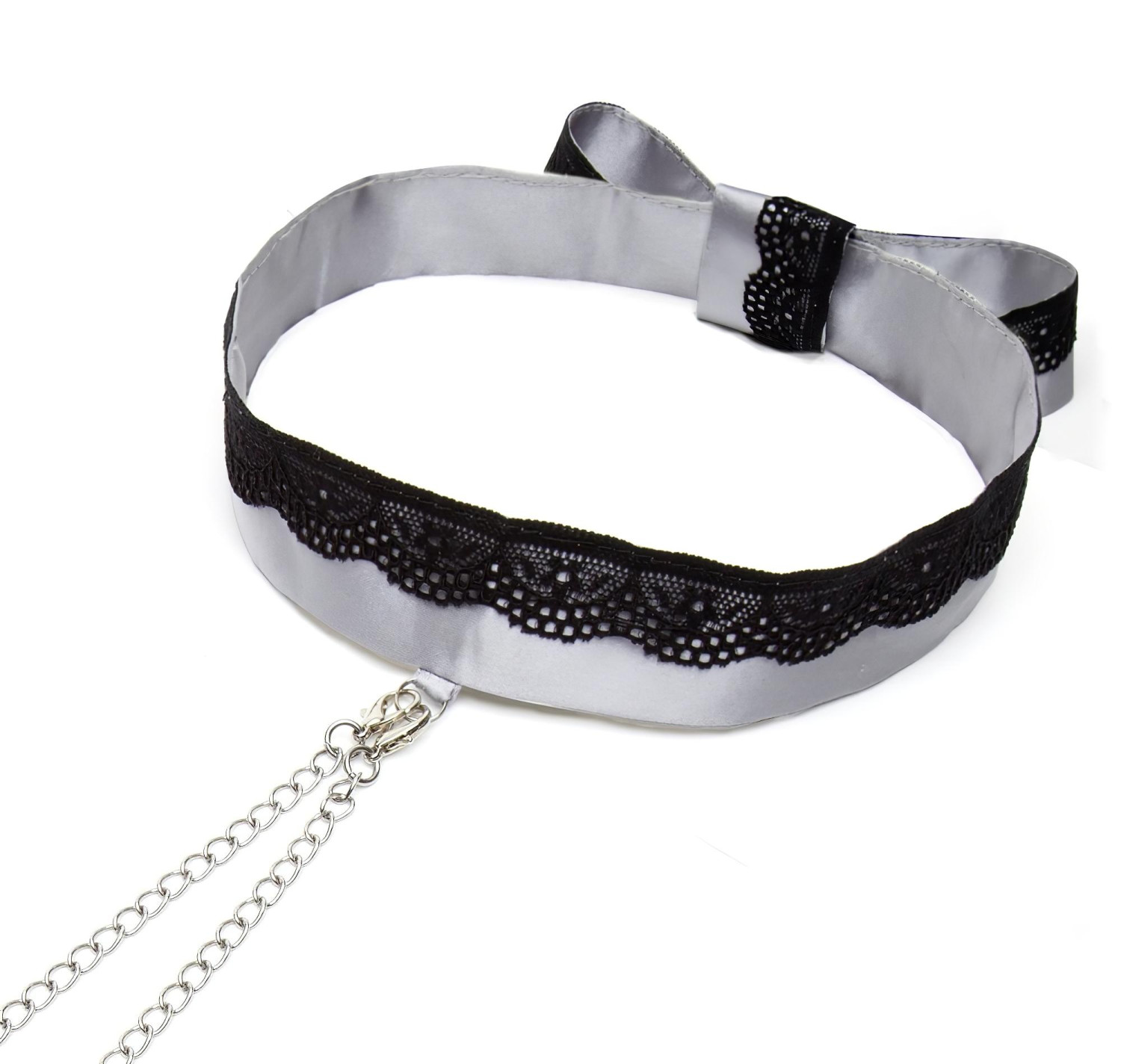 Sølvfarget satenghalsbånd, med kjede som kan feste brystklemmer.