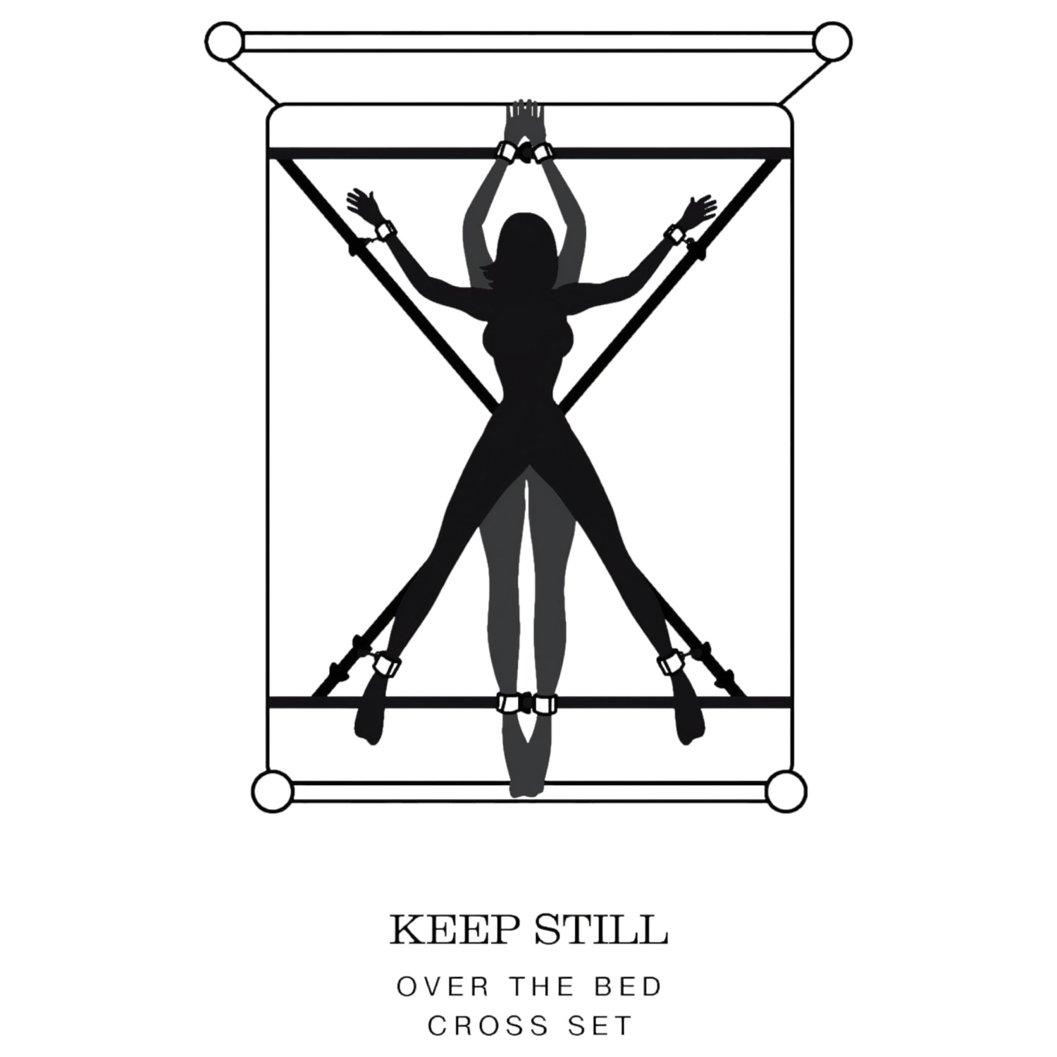 Plasser tverrbåndet under sengen, og fest de grå lange stroppene i riktig posisjon. Justér håndledd- og ankelmansjettene med borrelås, og fest dem med de små karabinkrokene. Bruk en øyebind for å forsterke sansene, og nyt en helt ny opplevelse.