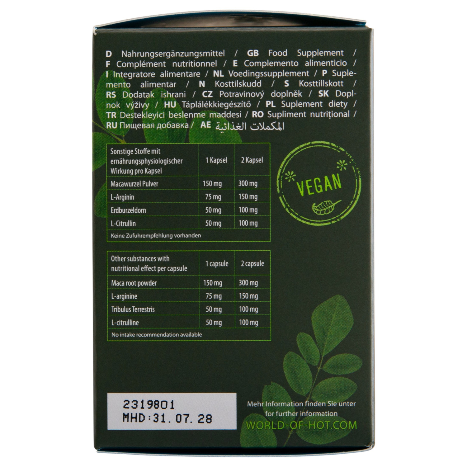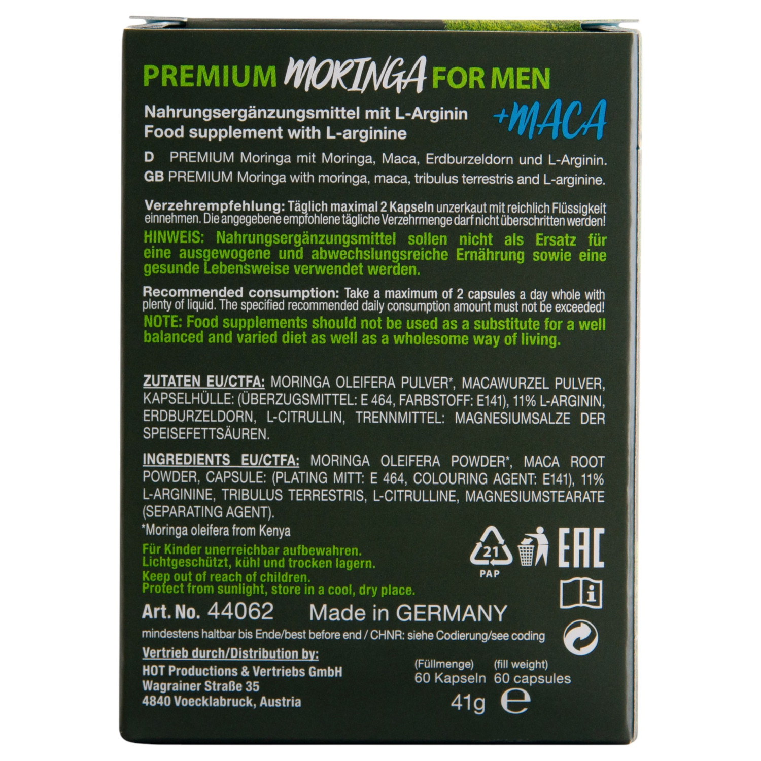 • Ingredienser: moringapulver, macarotpulver, L-arginin (11%), Tribulus terrestris, L-citrullin, kapselskall (E464), fargestoffer (E171, E141), antiklumpemidler (magnesiumsalter)