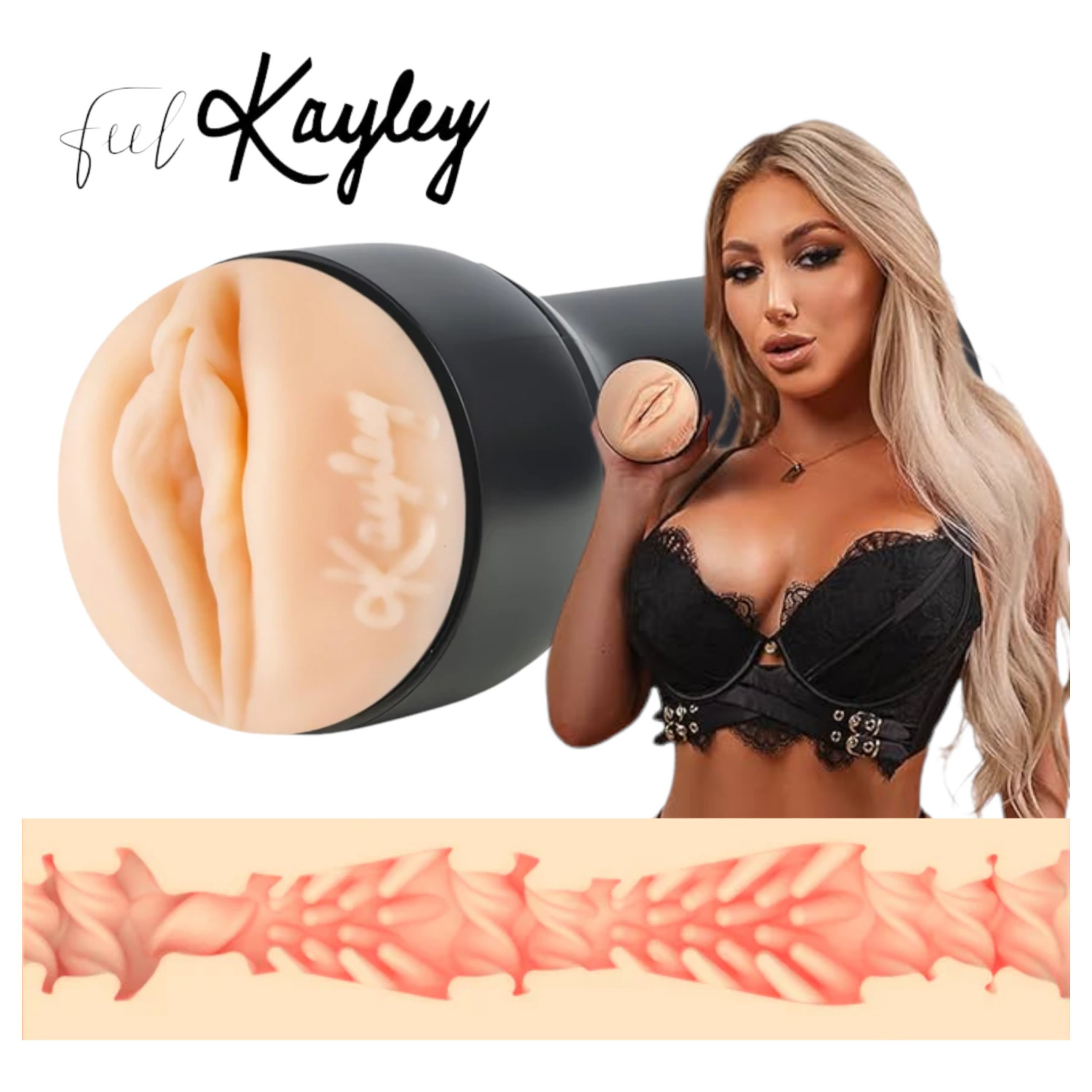 • Med Kayley Gunners signatur og utformet etter hennes vagina