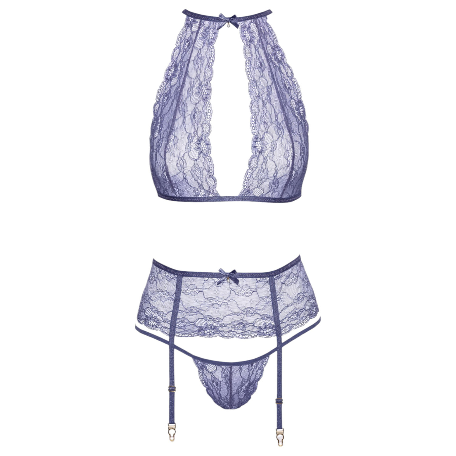 Dette vakre settet i gjennomsiktig blonder gir en subtil elegant og sensuell look. Denne tre-delte kombinasjonen har spesielle snittlinjer og detaljerte motiver som gjør bæreren enda mer tiltalende.