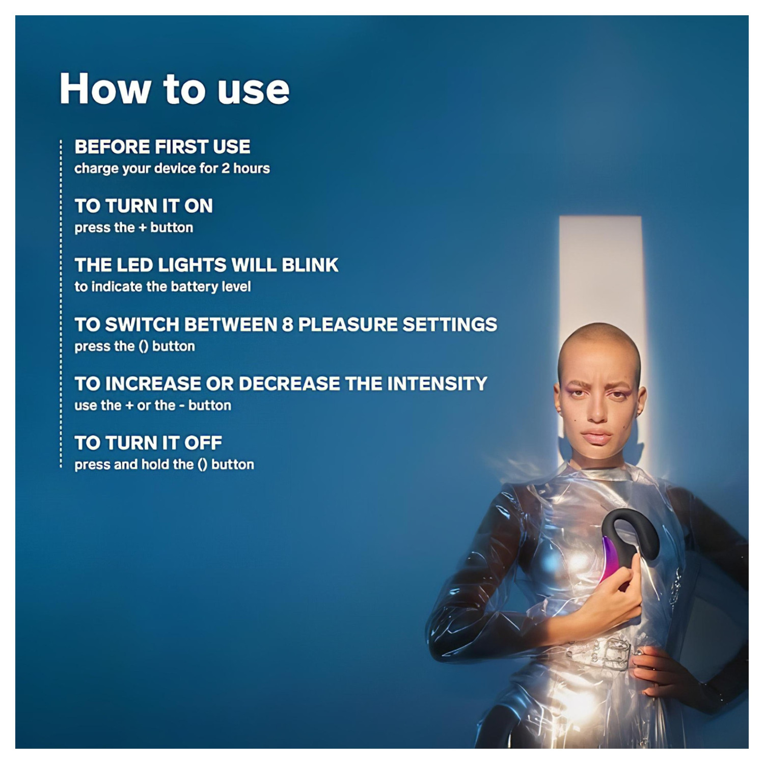 Etter påføring av glidemiddel, plasser vibratoren slik at G-punkt-stimulatoren er inne i skjeden, og klitorisskiven sitter tett mot klitoris. Start med forsiktige, inn- og utbevegelser, og eksperimenter med vibrasjonsmoduser og intensiteter. Den raske, små impulssugefunksjonen øker blodstrømmen for økt nytelse.