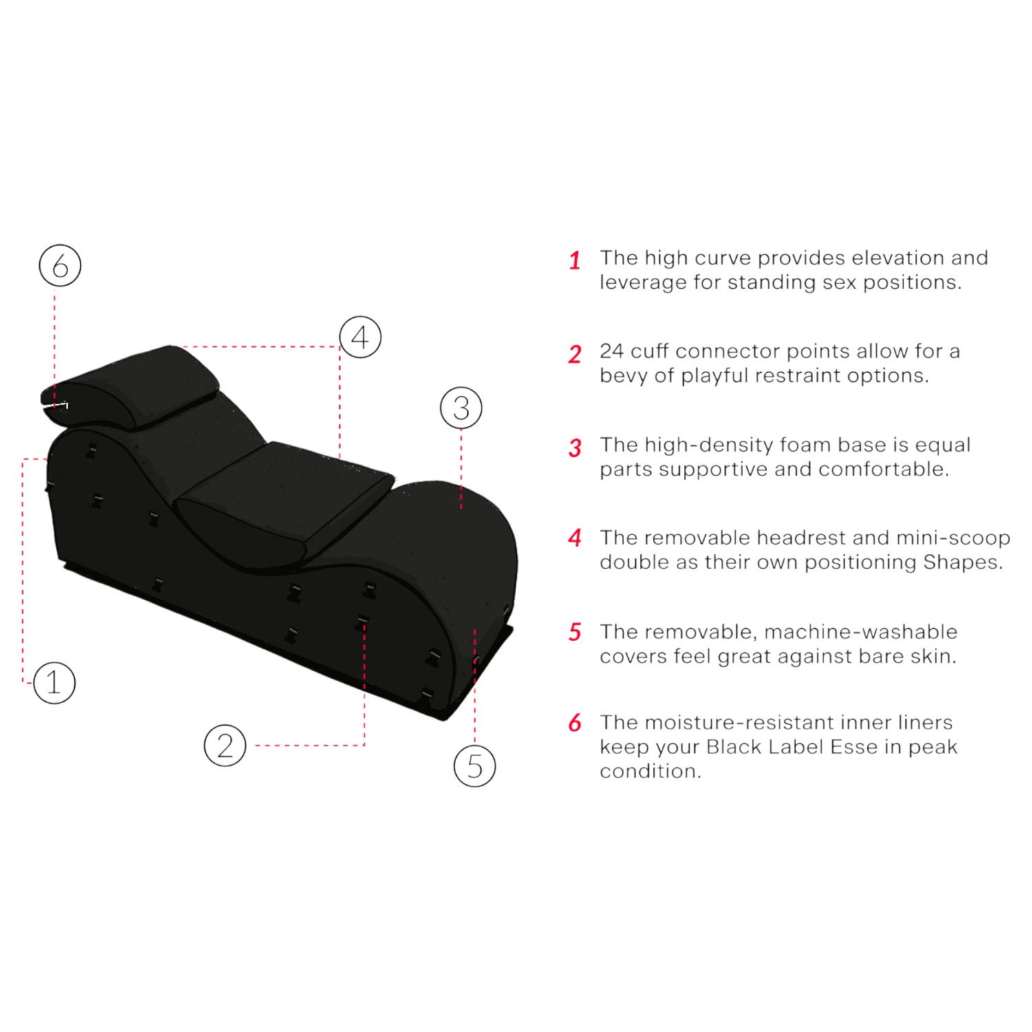 Liberator Black Label Esse er et elegant, ergonomisk designet sexmøbel som muliggjør mer komfortable, dypere og varierte sexposisjoner. Det er også et perfekt valg for myke bondage-leker, da det har mer enn 20 festepunkter og holder kroppen komfortabelt og stabilt i enhver stilling.