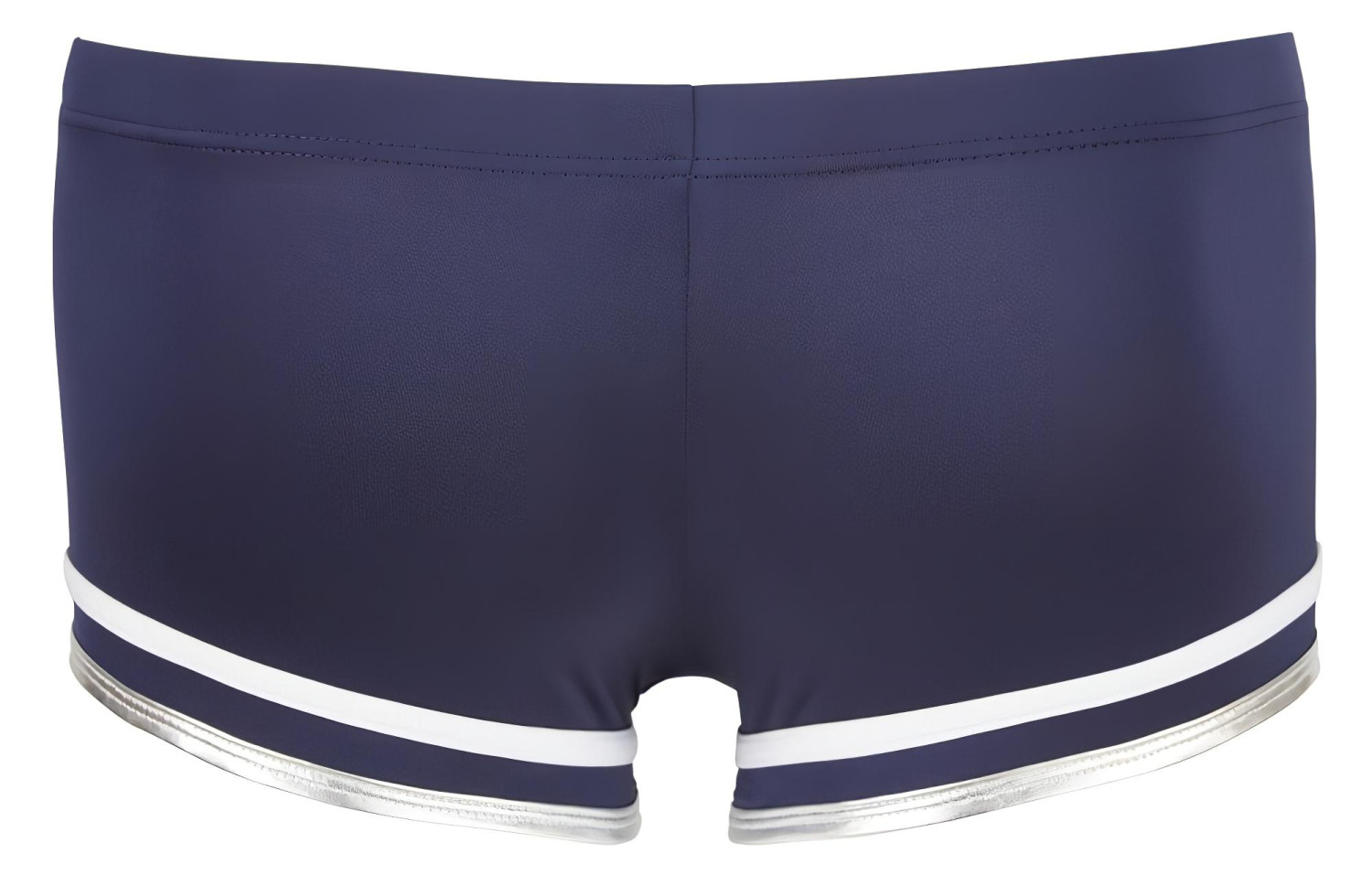 Behagelig komfortabel sjømannsbokser laget av fleksibelt, mørkeblått stoff, med en hvit plastglidelås foran og to hvite og en blå kant ved lårene. Bred, komfortabel elastisk midjebånd med fremhevet snitt foran.