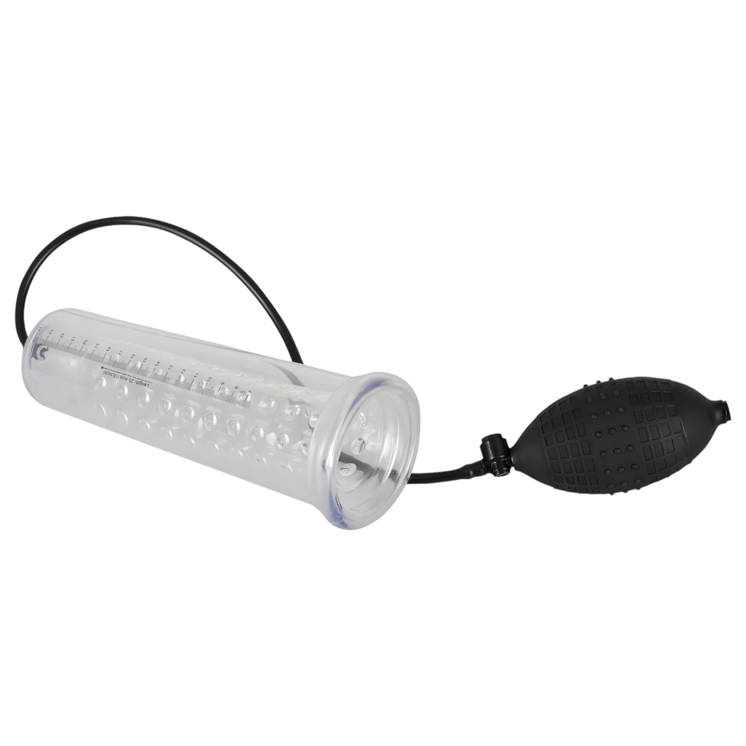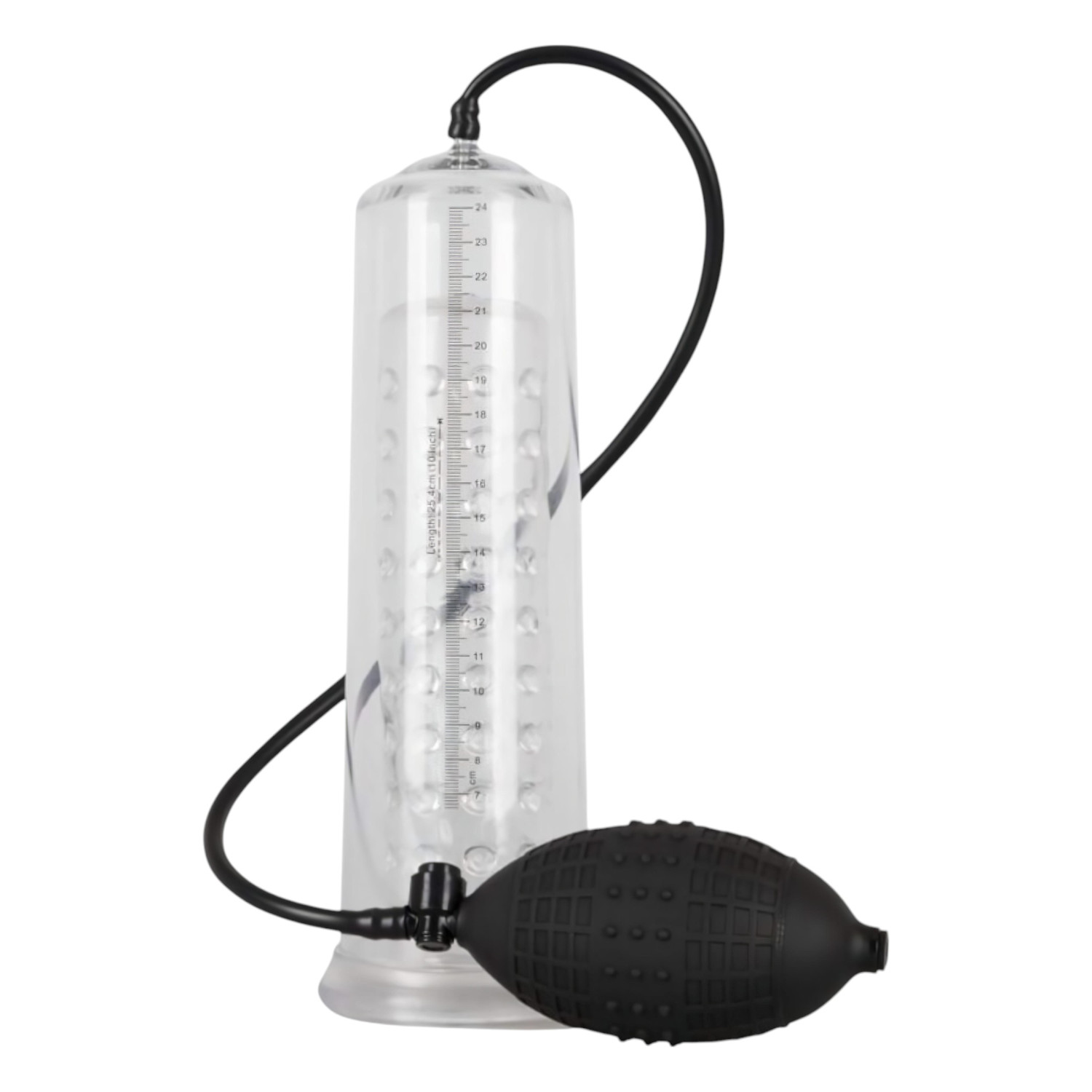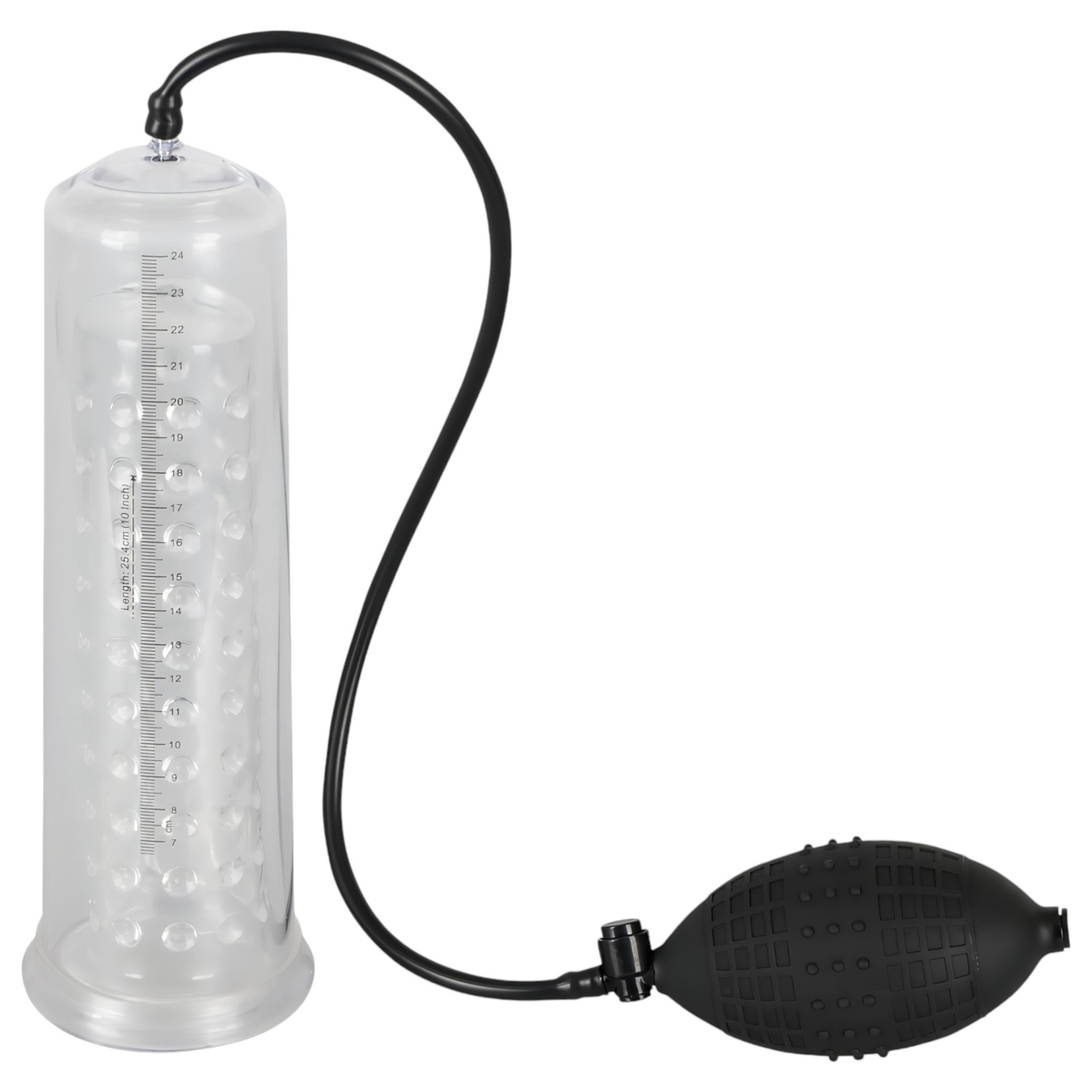Plasser penis gjennom den ekstra stimulerende, kulerformede silikonsmansjetten inn i vakuumsylinderen, og start deretter å pumpe med den store ballarmen. Det oppståtte vakuumet forårsaker økt blodtilførsel, som fremmer ereksjon og kan hjelpe med vekst. Følg resultatene med skalaen på siden av sylinderen. Bruk sikkerhetsventilen for å slippe vakuumet.