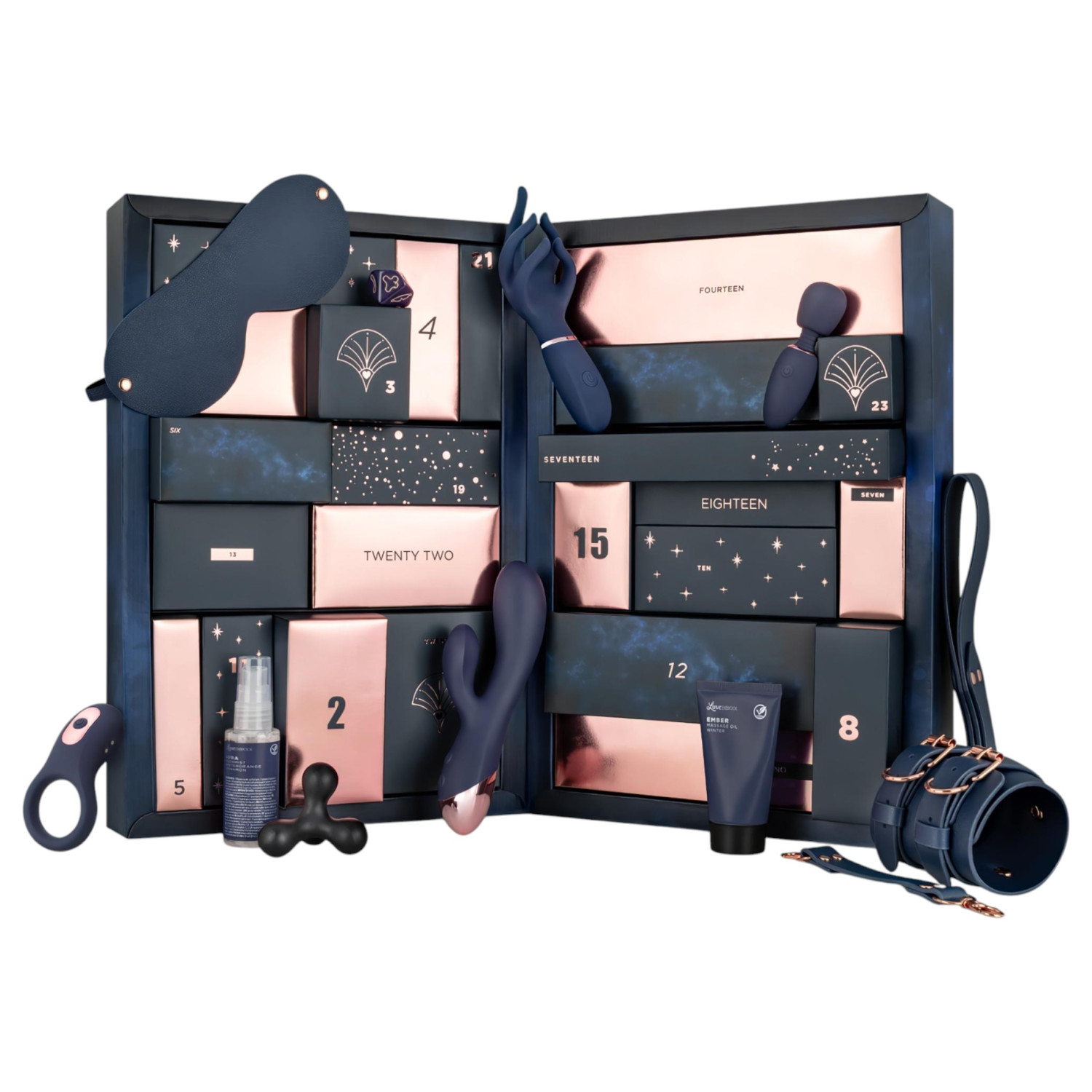 • 24 spesielle gaver: hver dag venter et nytt erotisk leketøy eller koselig overraskelse for å forsterke lysten og de intime øyeblikkene.