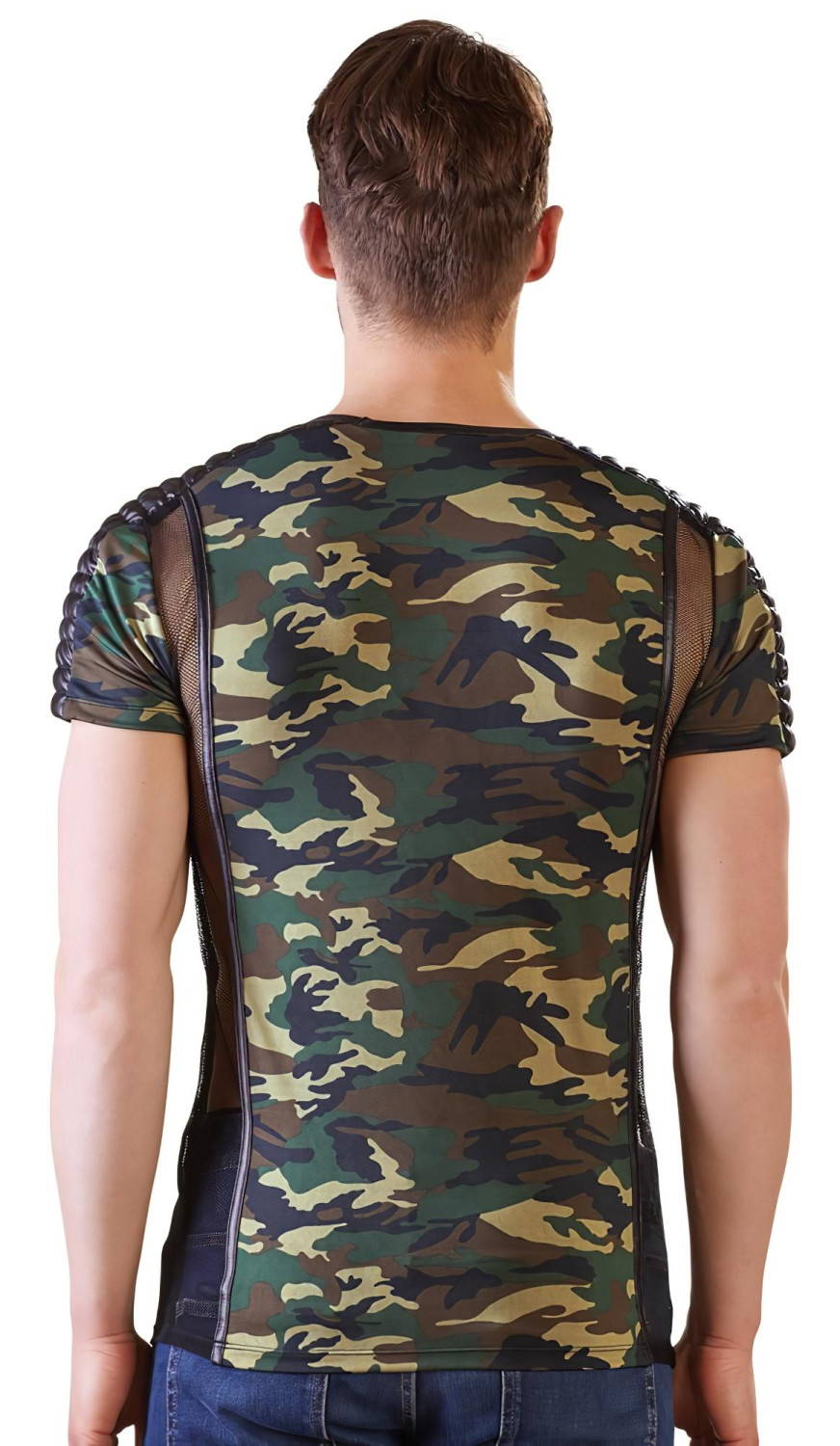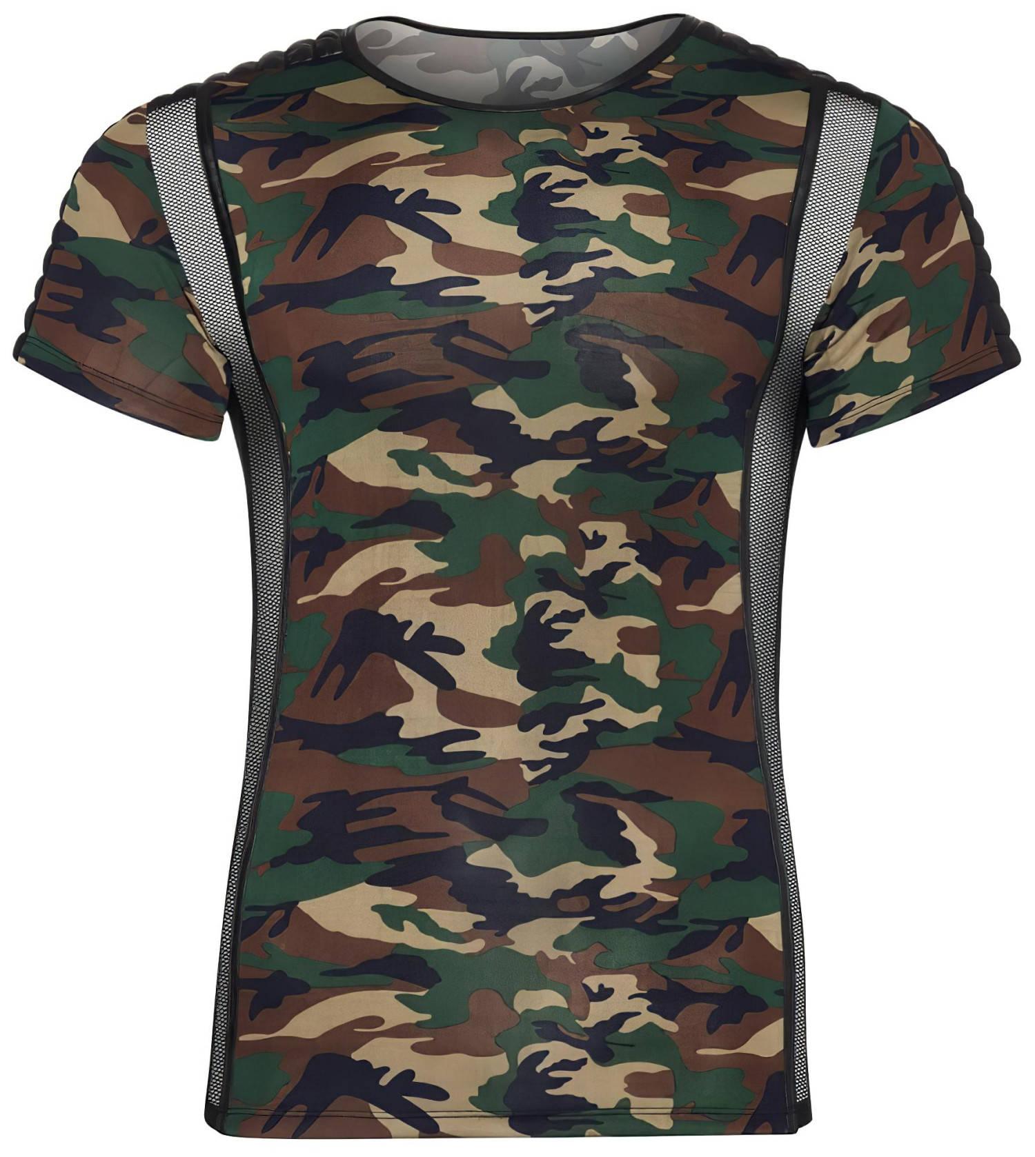 • 1 stk kamuflasjemønstret t-skjorte med gjennomsiktige nettingpaneler
