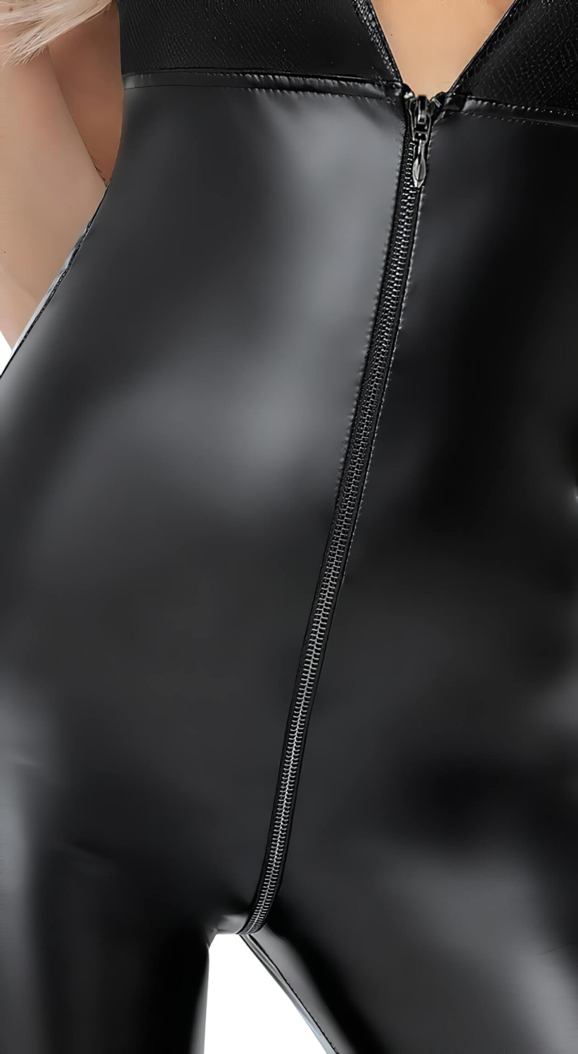 Ekstra dypt utringet, skinnende jumpsuit, som passer perfekt som Catwoman-kostyme eller Dominatrix-antrekk!