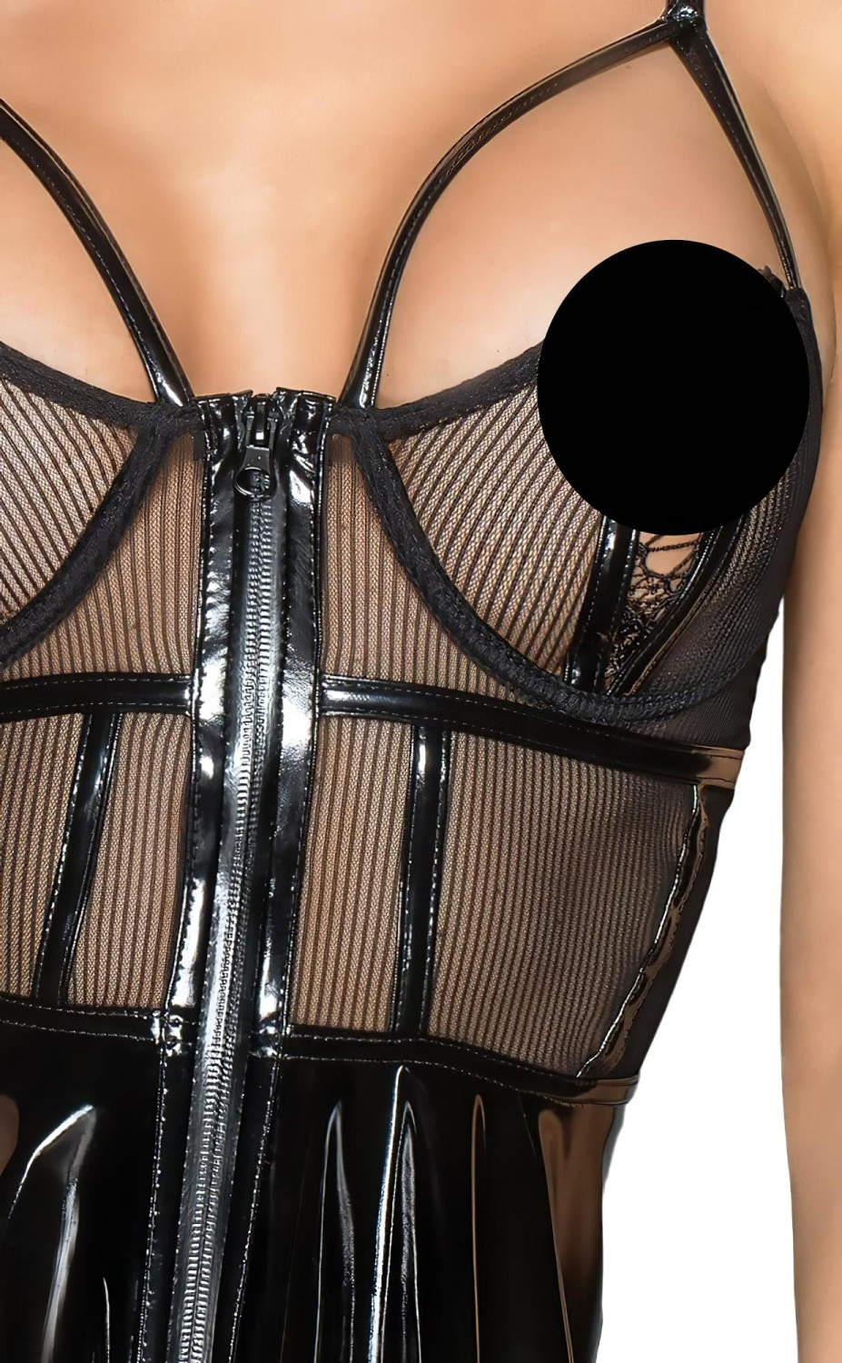 • Ekstravagant brystparti: Forsterket design med skinnende stropper som fremhever og innrammer brystene – selv brystvortene kan titte frem.