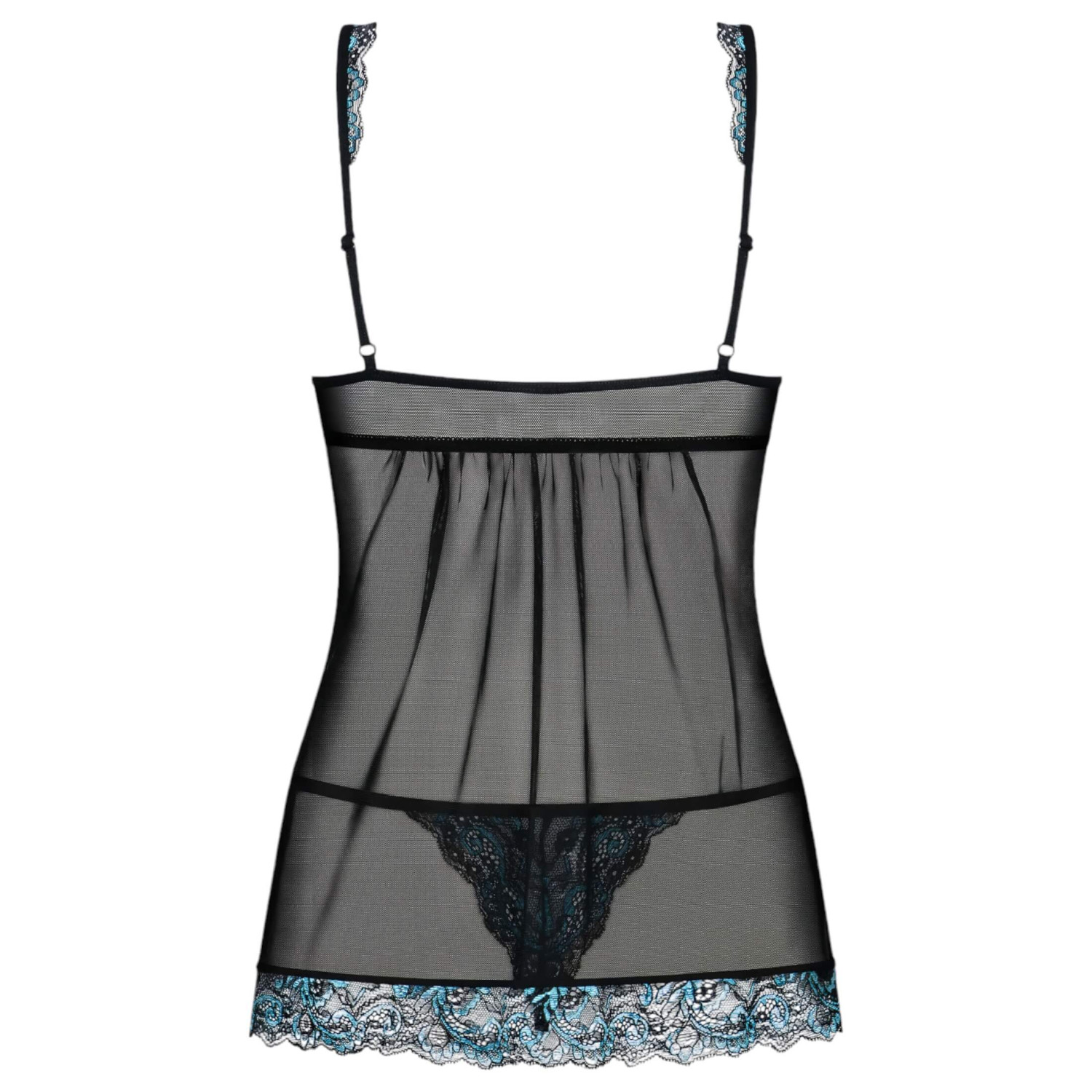• 1 stk gjennomsiktig babydoll med turkis brodert blonder, justerbare skulderstropper, plastklemme og satengbånd