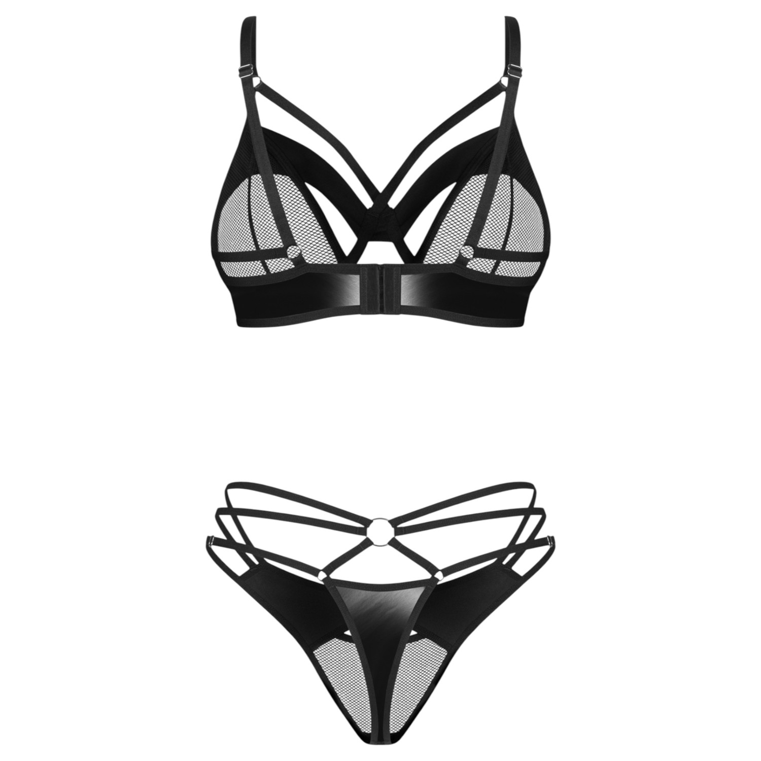 Den Obsessive Dominna - stroppete BH-sett (sort) er et dristig, moderne og erotisk undertøysett som kombinerer wetlook-glans med fin netting og et ekstremt stroppedesign.