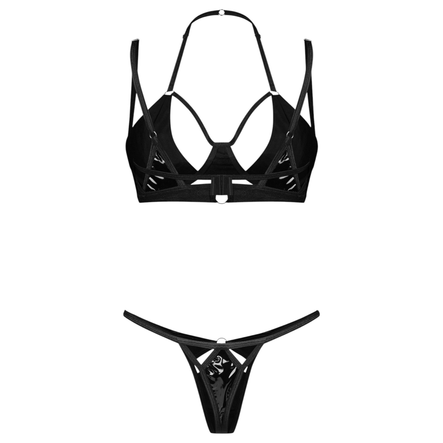 Dette svarte, skinnende vinyl settet er det perfekte valget hvis du ønsker et imponerende, dominerende, men likevel elegant utseende. Det skinnende vinylmaterialet tiltrekker umiddelbart oppmerksomheten, mens de elastiske og myke stroppene sørger for komfortabel bruk. De dekorative sølvfargede ringene og detaljene gir en spennende, fetisj-inspirert stil, og de modige utskjæringene fremhever sensuelt kvinnens kroppsformer. Et ideelt valg hvis du ønsker noe spesielt for natten!